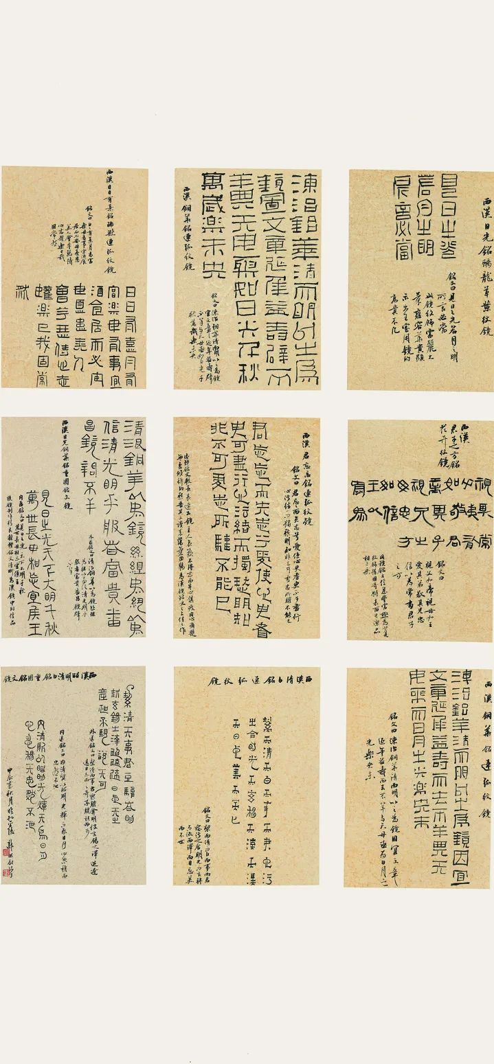 我在临摹研习的时候就重点关注了这些地方。选择了九面风格各异的镜铭临摹,他们有的字形疏朗开阔,有的紧致厚重,有些线条棱角分明,有的圆融无碍,更有些装饰线条变形夸张,偏旁反书,构件移位使得整体章法节奏分明,疏密有致,有很强的表现力。如何精准而恰当的传承和演绎镜铭书法是我当时思考最多的地方。我选择了九份制式相同的纸张,通过文字的大小,章法位置的差异,墨色的枯润,书写速度的变化,加之以题名、释文、落款等方式,力求更多的传承精明文字的细节和风格多样的整体风貌。