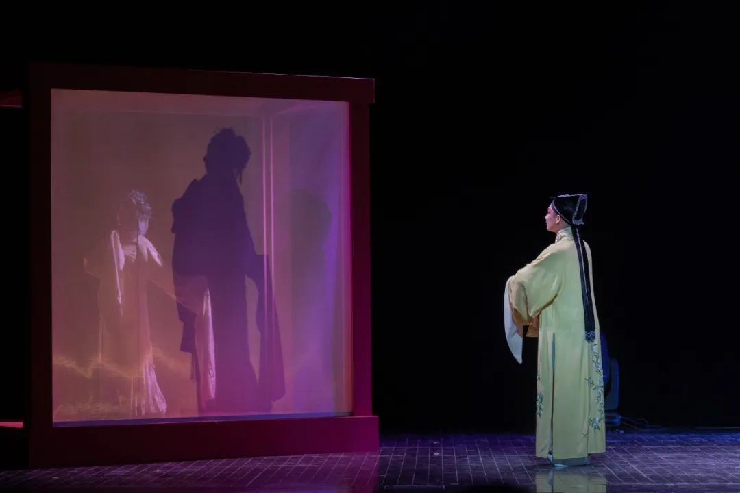 二是恰到好处的点睛设计。舞台上最引人注目的便是剧中出现的红色方形装置,如他自我感慨,任其大梦三千,最终还是被困于这囚笼之中。另外,在梦张生这场戏中,主创团队借助影子的映照表现崔莺莺,让观众未见其人但闻其声,将这场戏的重点聚焦于张生与金圣叹的对话,意、趣齐飞,营造出苏州园林般影影绰绰的美感。