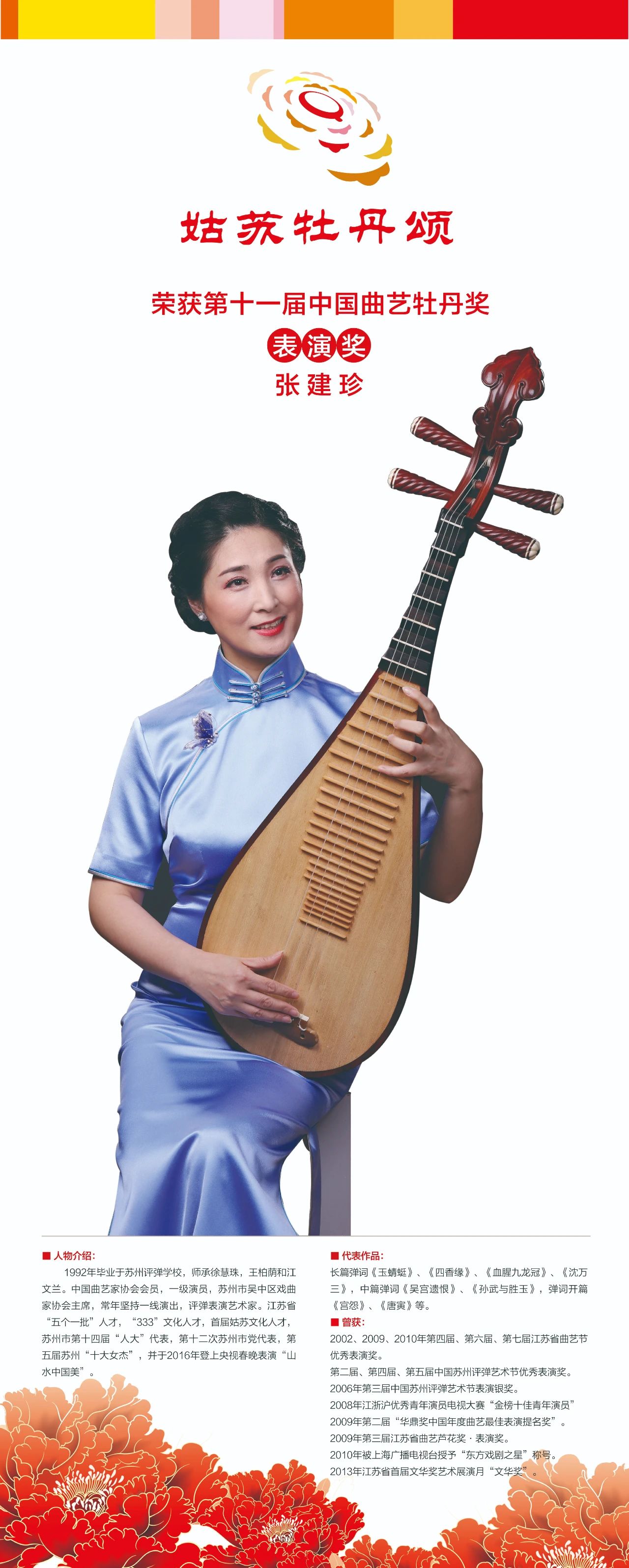 苏州评弹表演艺术家张建珍,为江苏捧得第十一届中国曲艺牡丹奖表演奖。张建珍现任苏州市吴中区戏曲家协会主席,国家一级演员。她师承徐慧珠、王柏荫、江文兰三位著名评弹表演艺术家,与丈夫马志伟同为苏州吴中区评弹团弹词演员。在本届“牡丹奖”舞台上,这对艺术伉俪珠联璧合,以精湛的技艺尽展苏州评弹的独特魅力。