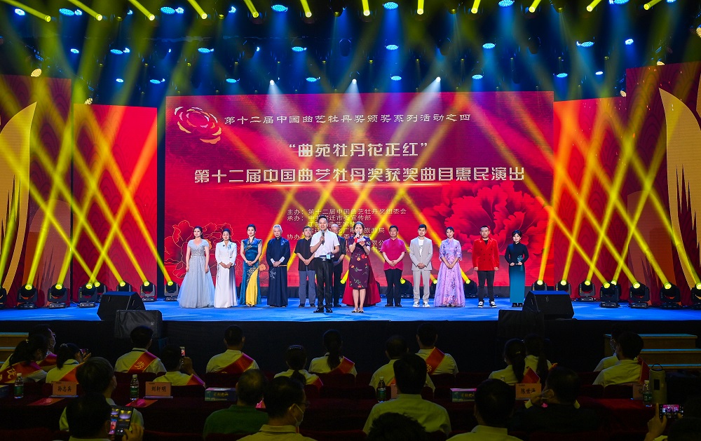 牡丹回报沃土,曲艺回馈人民。9月17日下午,由第十二届中国曲艺牡丹奖组委会主办,中共宿迁市委宣传部、江苏省曲艺家协会、宿迁市文化广电和旅游局承办,中共宿城区委宣传部、江苏双沟酒业股份有限公司、江苏省曲艺家协会琴书大鼓艺术委员会协办的第十二届中国曲艺牡丹奖颁奖系列活动之四——“曲苑牡丹花正红”第十二届中国曲艺牡丹奖获奖曲目惠民演出在宿迁市双沟酒业职工礼堂成功举办。演出现场名家新秀云集,精彩节目荟萃,观众笑声不断。
