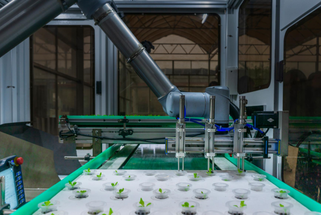 2024年1月17日摄于宿迁某新材料有限公司,机械手取片系统上下翻飞,正有序工作着,车间一片忙碌景象。