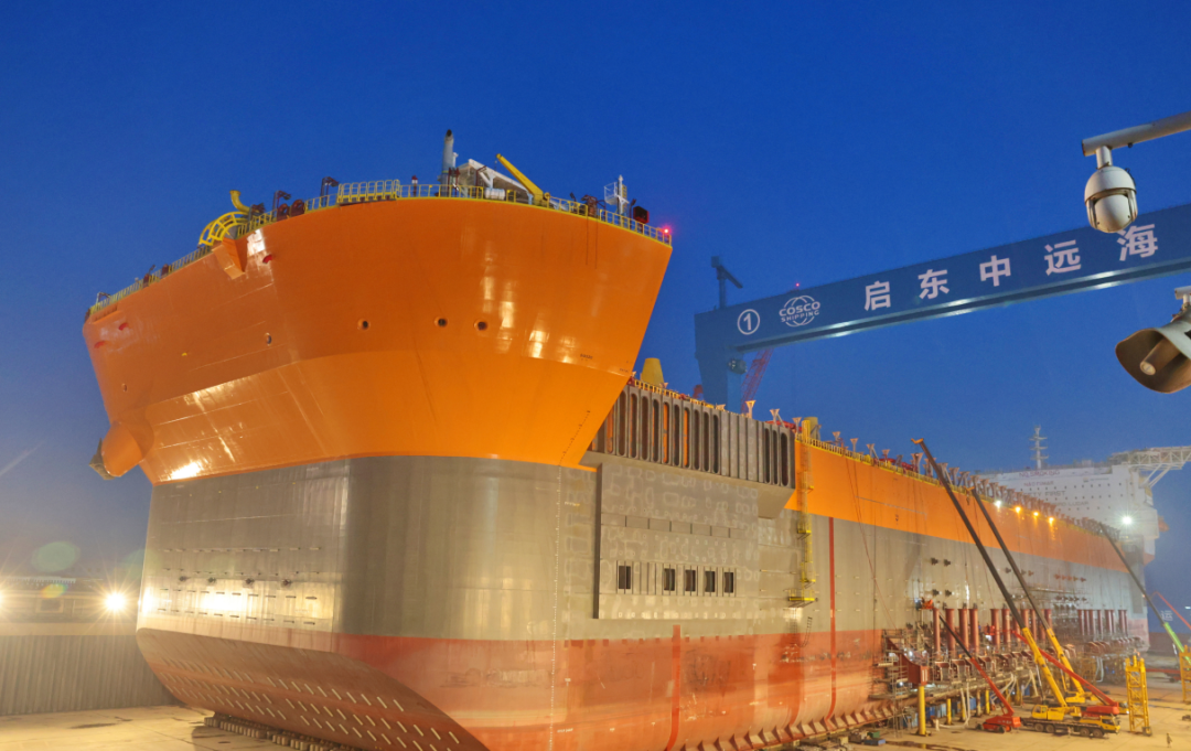 2023年4月,启东中远海运海工船坞中,世界最大“海上移动工厂”挑灯夜战建造忙,这是目前世界上最大吨位级的新型海上浮式生产储卸油船。