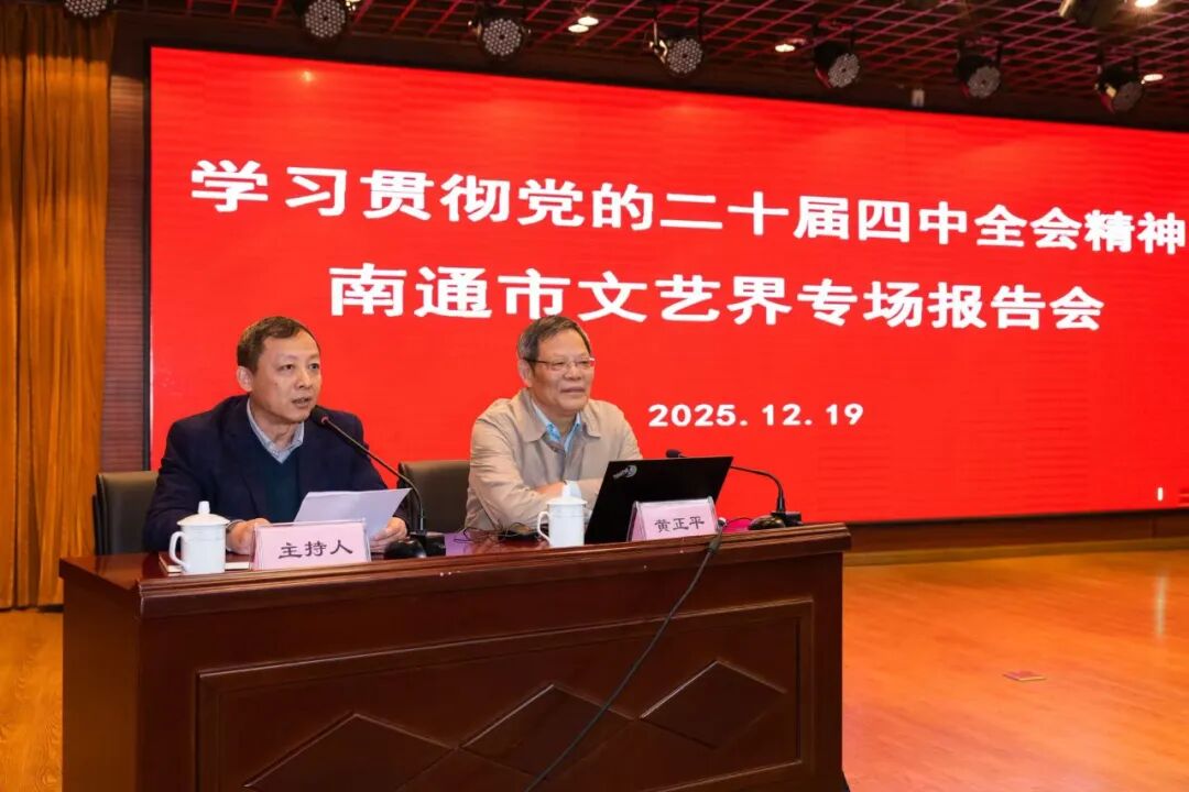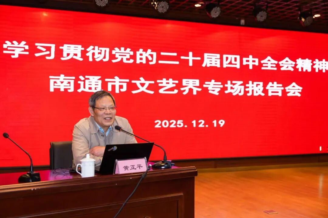 为深入学习宣传贯彻党的二十届四中全会精神,切实把广大文艺家和文艺工作者的思想和行动统一到党中央决策部署上来,12月19日下午,学习贯彻党的二十届四中全会精神南通市文艺界专场报告会在南通市文艺之家报告厅举行,全国基层理论宣讲先进个人、江苏省习近平新时代中国特色社会主义思想研究中心特约研究员,中共南通市委宣传部原副部长、二级巡视员黄正平,给全市文联系统近200名文艺工作者做了一场精彩的宣讲报告。