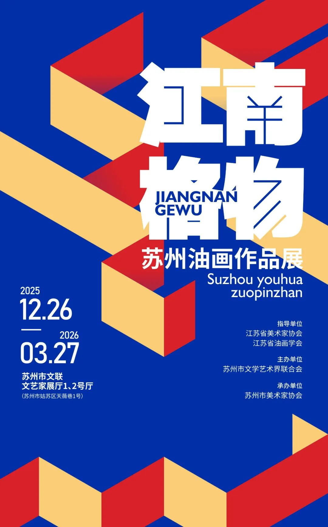 为全面践行习近平文化思想,深入贯彻落实党的二十大和二十届历次全会精神,坚持出成果和出人才相结合、抓作品和抓环境相贯通,落实苏州文化强市“811”计划,进一步推动苏州油画艺术发展和人才队伍建设,促进苏州美术事业繁荣,由江苏省美术家协会、江苏省油画学会指导,苏州市文学艺术界联合会主办、苏州市美术家协会承办的“江南格物——苏州油画作品展”将于2025年12月26日在苏州市文联文艺家展厅拉开帷幕。