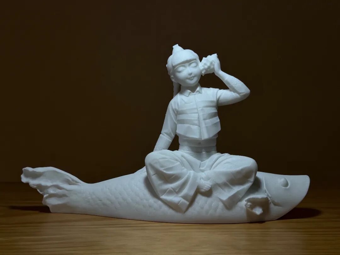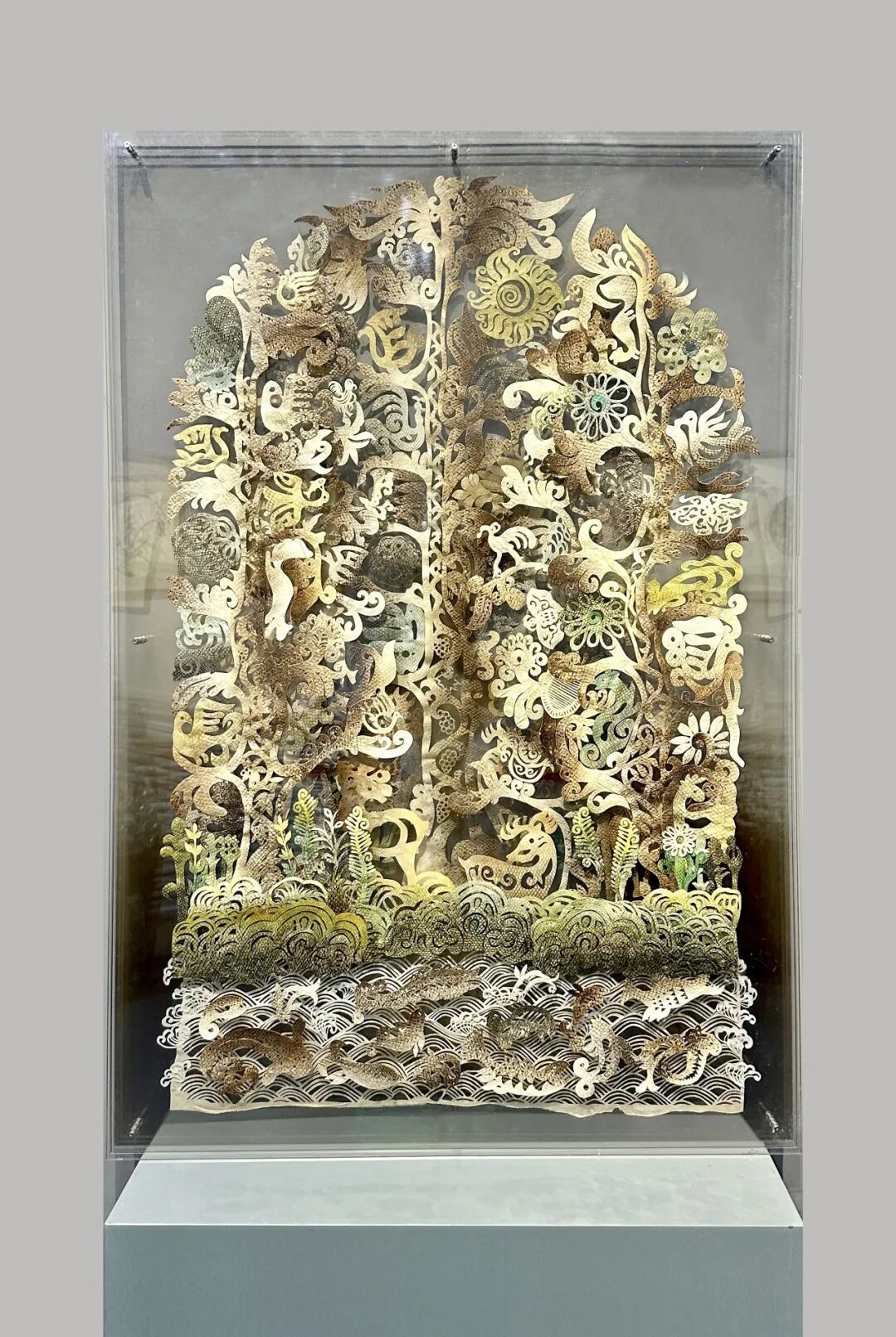 杨眉长期致力于以鱼皮技艺呈现赫哲族独特的民风民俗,其作品以天然鱼皮为材料,将传统鱼皮镂刻技艺与现代光影艺术相结合,创造“多层镂刻透叠技法” 构建三维空间,实现了 “材质-技艺-空间”的三元互动,将作品从“平面装饰”推向“空间装置”,为工艺转译提供了创新范式。