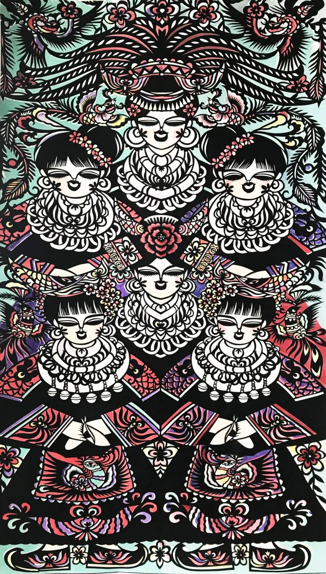 岳红霞的剪纸艺术特色鲜明,她多以黔西北少数民族生产生活为题材,融合拼色、接色、垫色等技法,将图腾符号、吉祥图像融入其中,造型大胆夸张,刀法流畅,线面交织,具有浓郁的地方特色。