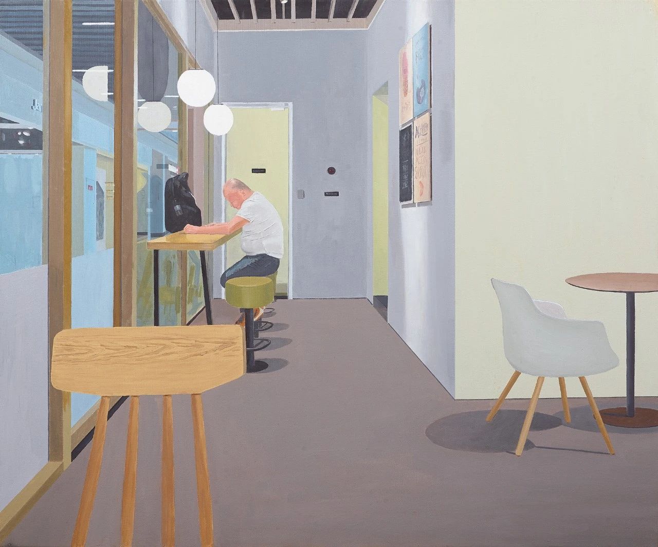 时光留不住,而绘画可以将我们定格在那转瞬即逝的心动瞬间。偶然在一快餐店看见一位不修边幅的父亲坐在窗口为女儿点冰激凌。女儿去取餐时,父亲边看着孩子边将身上沉重的包裹放下,缓缓弯腰低头,这十几秒如同静止了一般。当女儿跑回来的时候,父亲立马支棱起了身板,挺起胸膛,满脸欢笑。幸福的孩子眼里父亲总是温柔且坚毅的,而父亲往往在孩子不知道的时候给自己充个电。第一眼见这父亲的视觉感受是“中年油腻、猫腰、疲惫和躺平”,作为一个心理工作者,我更看到了一种为美好生活的准备状态,我希望称之为“充电”的状态。