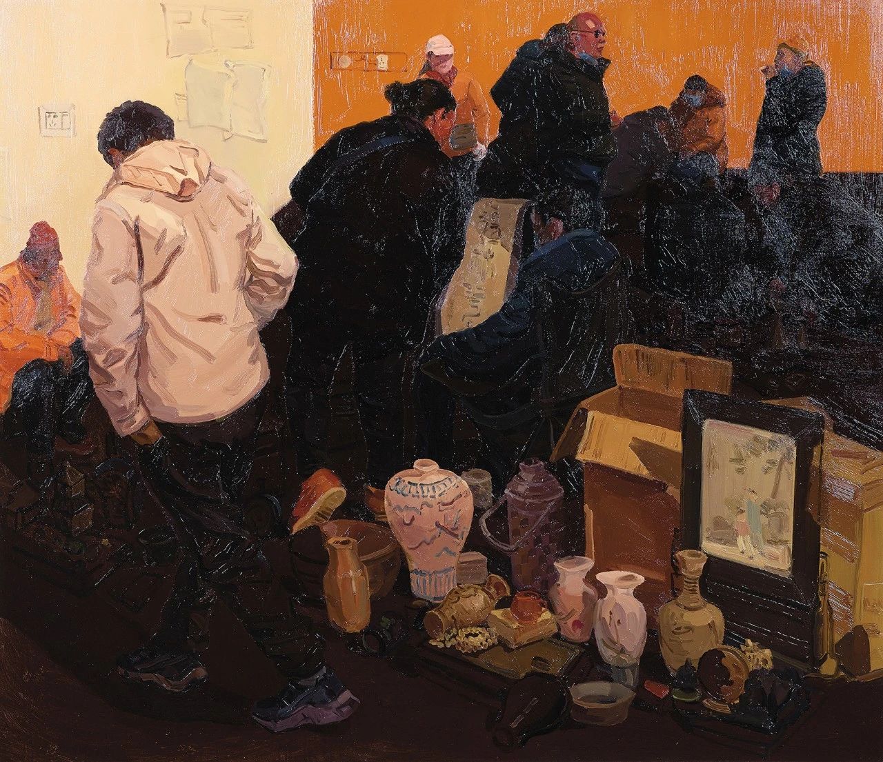 市井文化是一种极为活跃、极具生命力的文化,要了解中国的城市与社会,“市井”则是其不可忽略的一个重要部分。市井题材绘画是艺术关照社会的一面镜子,直观真实地反映了政治、经济、文化、民风民俗以及市民审美观念的变迁。周末的午后,伴着斜阳,走在唐人文化园的集市中,周遭映入眼帘的一切皆充斥着时间的气息,那些老旧的瓷器、书籍、旧物,像一位位充满故事的旅人,无比的吸引着我。简单朴素的日常生活中往往蕴藏着生活美和艺术美,真实的生活体验与感悟才是艺术创作的原始动力,该幅创作正是取材于与朋友的古玩城之旅。