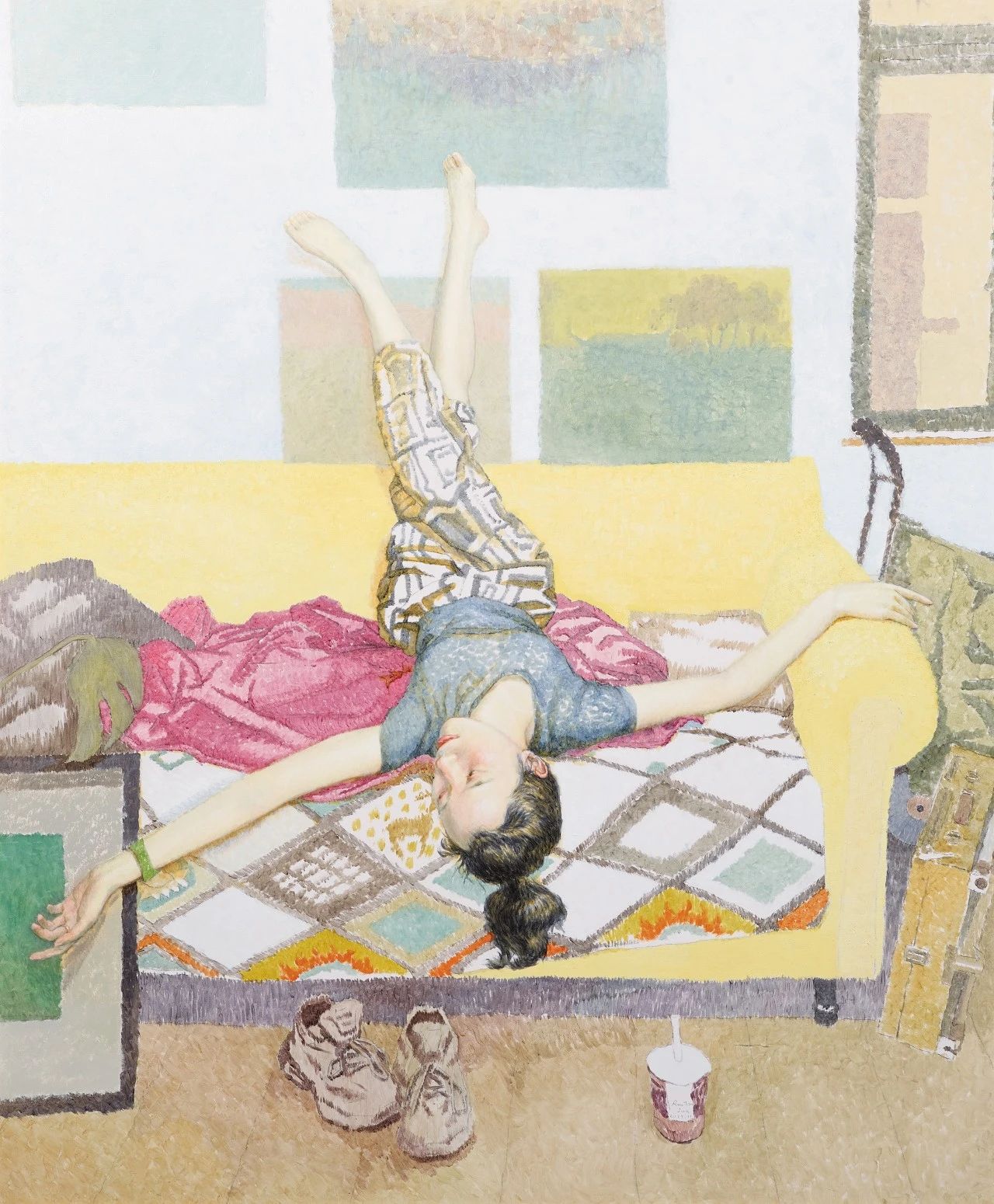 《画室的黄色沙发》描绘了朋友秋雯在画室小憩的场景,轻松舒适的氛围让我很想把它表现出来。我喜欢文艺复兴时期湿壁画褪色后淡雅的色彩关系,同时也钟爱油彩颜料的透明质地,一直希望能融合它们的特点来表现自己对颜色的感受。为了更好的体现颜色细微变化,作画过程中更多强调了固有色的差异,并放弃大部分明暗与体积关系来达到目的。对于留白的应用也是我一直在坚持的一种尝试,希望能在油画媒介的使用上延续些许中国的传统审美。