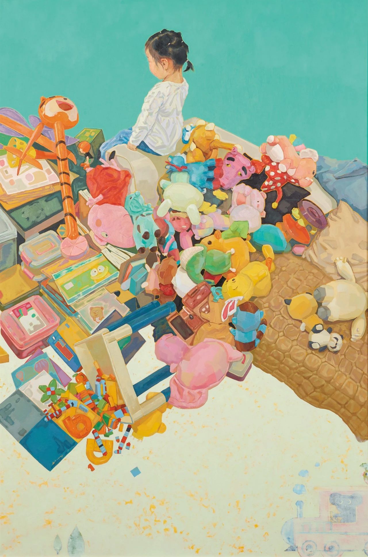 在孩子成长的过程中,父母总希望竭尽所能给与孩子所需要的一切,作为一名父亲我也不例外,无论是物质上还是精神上,都尽量满足女儿,我希望她能拥有一个快乐的童年。小时候期盼大人们给我们买各种玩具,哪怕是一张很小的贴纸也能让我高兴好一阵子,为了让女儿也拥有这种喜悦感,我们会时常给孩子买玩具,慢慢的,她变成一个“富有”的孩子,这幅画描绘并记录了这份“富有”。各种玩具之间颜色的碰撞以及形体与人物的构成是我描绘的重点,希望正在看画的你也能从中体会到多彩的童真。