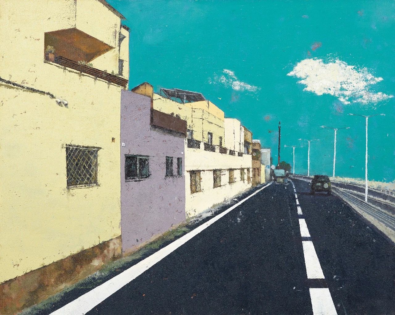 作品题材源于滇越铁路碧色寨的一角,那是修建铁路时期建造的法式建筑群,展现出一种独特的人文风貌。这样风格的建筑保留下来并不多,于是在作品构图上我主观处理了整体的结构同时依旧保留建筑的风格特征。画面将鲜亮的色块与强烈的透视相结合,在晴空之下,这样的对比让小镇显得格外鲜活生动。通过还原当时的一处风光,希望我们能在喧嚣的生活里感受到心中的那一丝宁静。