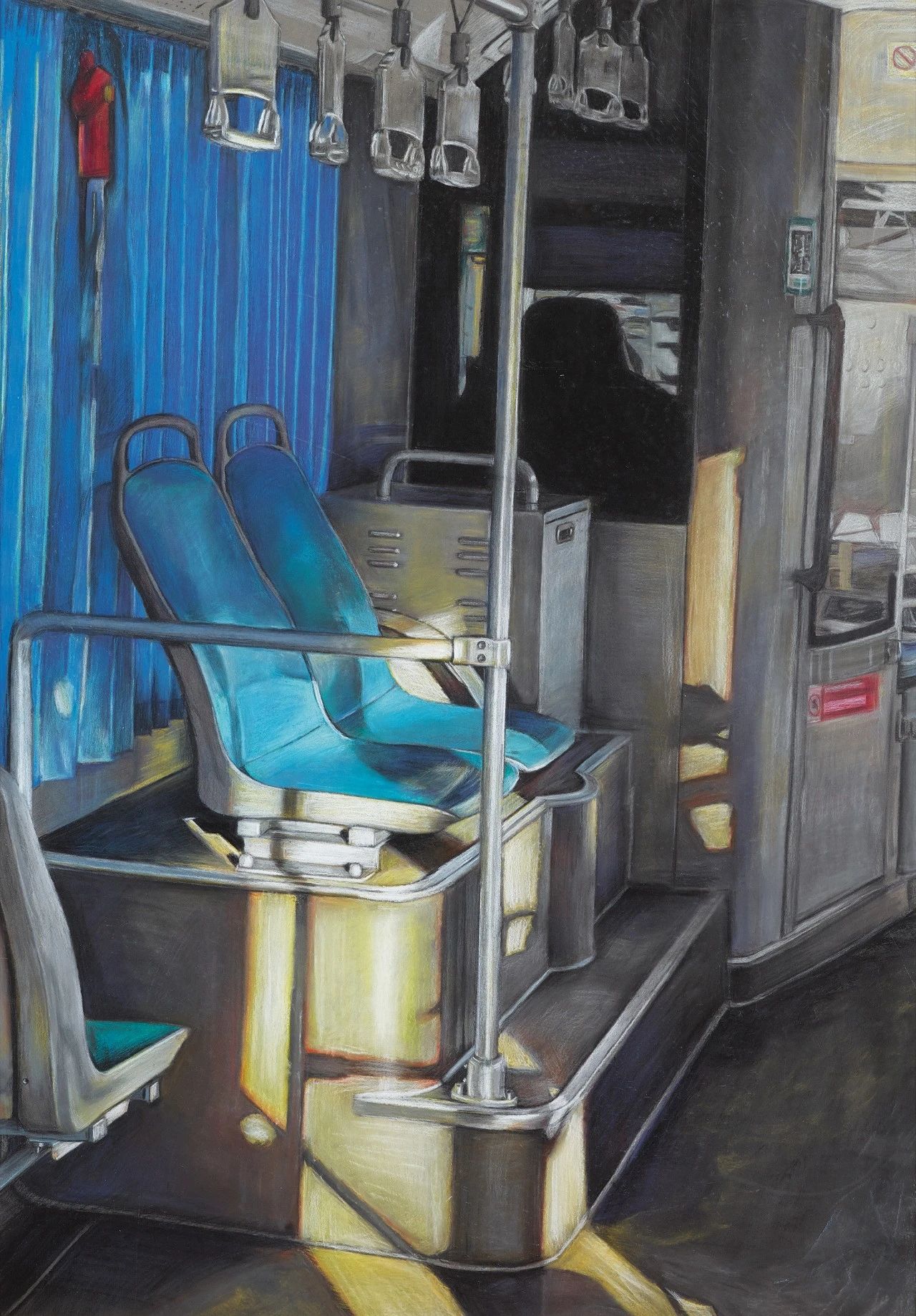 本幅作品运用色粉独特的优势进行创作,呈现的是晌午特殊光线下的场景,手法写实,色彩和谐。绘画中的光线是非常重要的,在创作中,我致力于抓住这种感受:炎炎夏日,阳光灼热,人们迫不及待地跑上久等的公交车,拉上帘子,享受空调带来的凉爽。画面运用灰色调子,光线下公交车上的金属栏杆、塑料凳子、透明把手等不同质感的物品有着不同的光泽,与强烈的光线相互映衬。灰色调子中冷暖色相互对比,在不同的光线下产生微妙变化,形成了一幅色彩和谐的《朝·晌·暮》。
