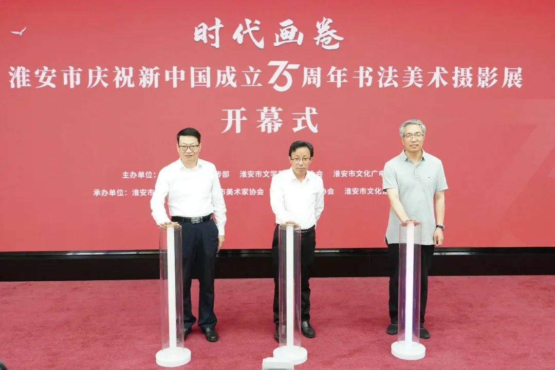 9月29日上午,“时代画卷”——庆祝中华人民共和国成立75周年淮安市书法美术摄影展在淮安市文化馆正式开幕。市委宣传部副部长、市社科联主席曾业桃出席开幕式并讲话,与市文联党组书记、主席王维国,市文联副主席、市书法家协会主席姜筱卉共同为展览揭幕。