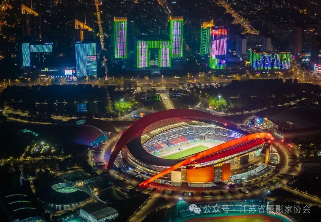 11月1日晚,南京奥体中心灯火璀璨,苏超决赛在此激情上演。夜幕下,周边楼宇化身巨幕,轮番打出“苏超加油”“汗洒绿茵场”“草根也疯狂”等炽热口号,将全城目光聚焦于此。邵丹 摄