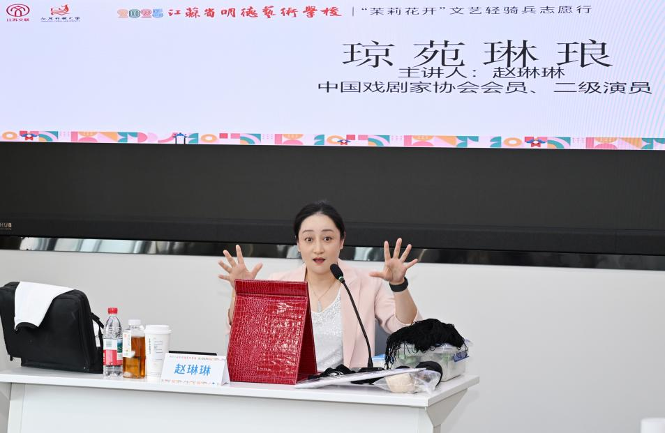 7月25日上午,由江苏省文学艺术界联合会、江苏开放大学联合创办的“江苏省明德艺术学校”系列培训第三场活动精彩开启。此次活动特别邀请到中国戏剧家协会会员、江苏省戏剧家协会会员、二级演员赵琳琳老师,带来题为《琼苑琳琅》的专题讲座。讲座由我院教师曹子达主持。