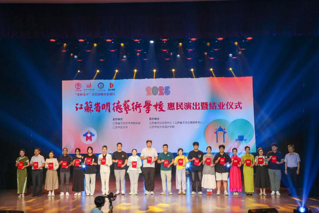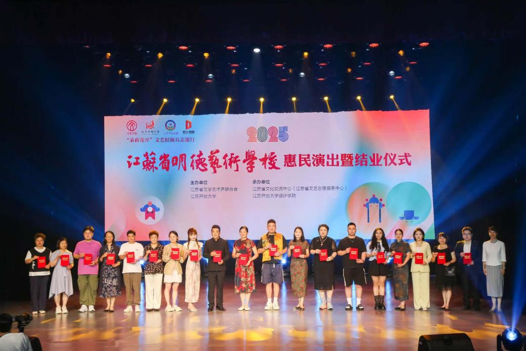 此次活动是江苏省明德艺术学校首期培训的成果展示,也是“茉莉花开”文艺轻骑兵志愿行的生动实践。文联概况党组成员、副主席刘轩明和江苏开放大学党委常委、副校长罗逾兰出席活动,并为首期50名参训学员颁发结业证书,见证他们在艺术研修之路上的成长与蜕变。