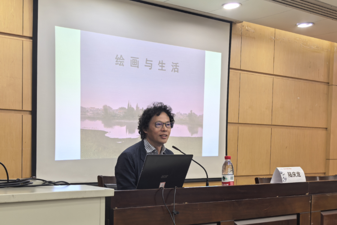 下午,中国美术家协会副主席、江苏省美术家协会主席陆庆龙教授则以《绘画与生活》为题,以“生活是艺术的源泉” 为核心观点,深入阐述绘画与生活的深层关联。他指出,艺术源于生活,既是对生活趣味的生动表达,也是人类智慧的集中体现。他将生活体验划分为被动感受、主动观察与现实经历三种类型,同时提出 “过去的生活、现在的生活、梦想的生活” 共同构成艺术创作的时空维度。围绕艺术创作全流程,陆主席给出具体路径:通过实践深入体验生活、通过写生精准表现生活、通过取舍深刻感悟生活、通过创作理性思考生活。他进一步主张,生活既需要丰富多彩的体验,也需要简单纯粹的内核,“生活到处都充满了美,我们要有敏锐的、善于发现美的眼睛”。这场讲座为艺术从业者与爱好者提供了明确指引,引导大家从平凡生活中发现创作灵感,用画笔传递对生活的热爱与思考。