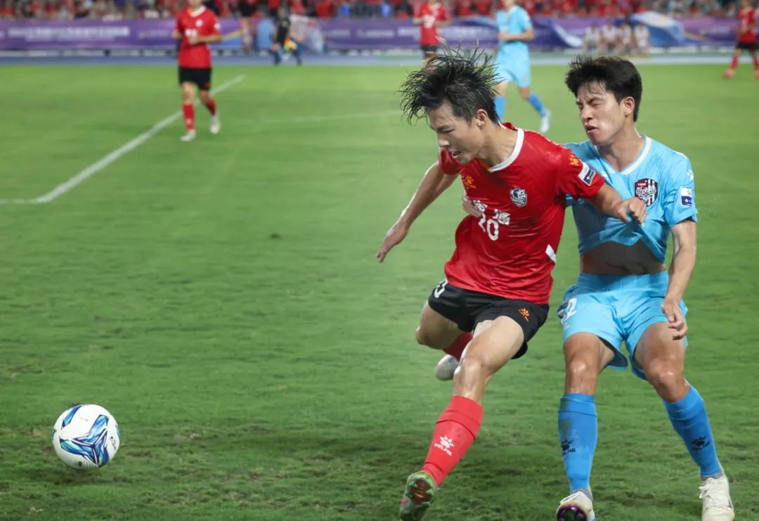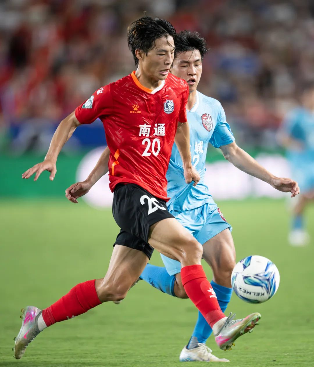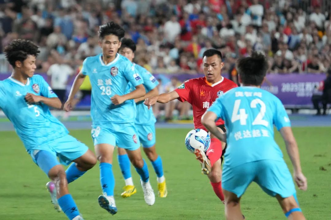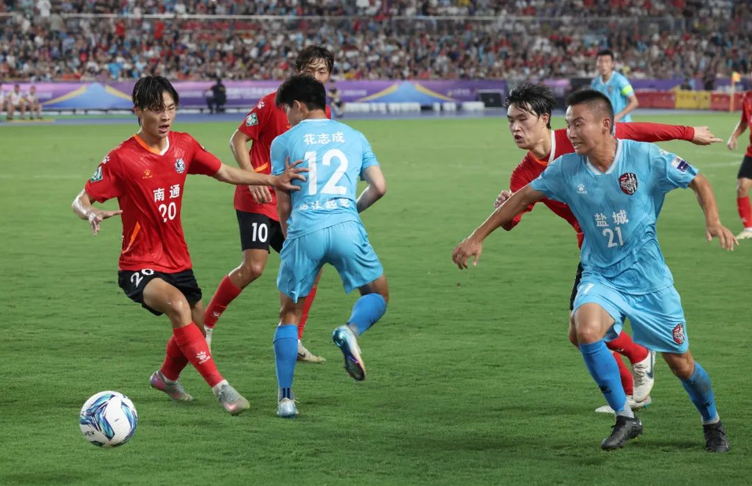 7月19日晚”苏超”比赛现场,盐城队(浅蓝色球衣)与南通队(红色球衣)球员在绿茵场展开激烈对抗,全力争夺球权。戚晓云 摄