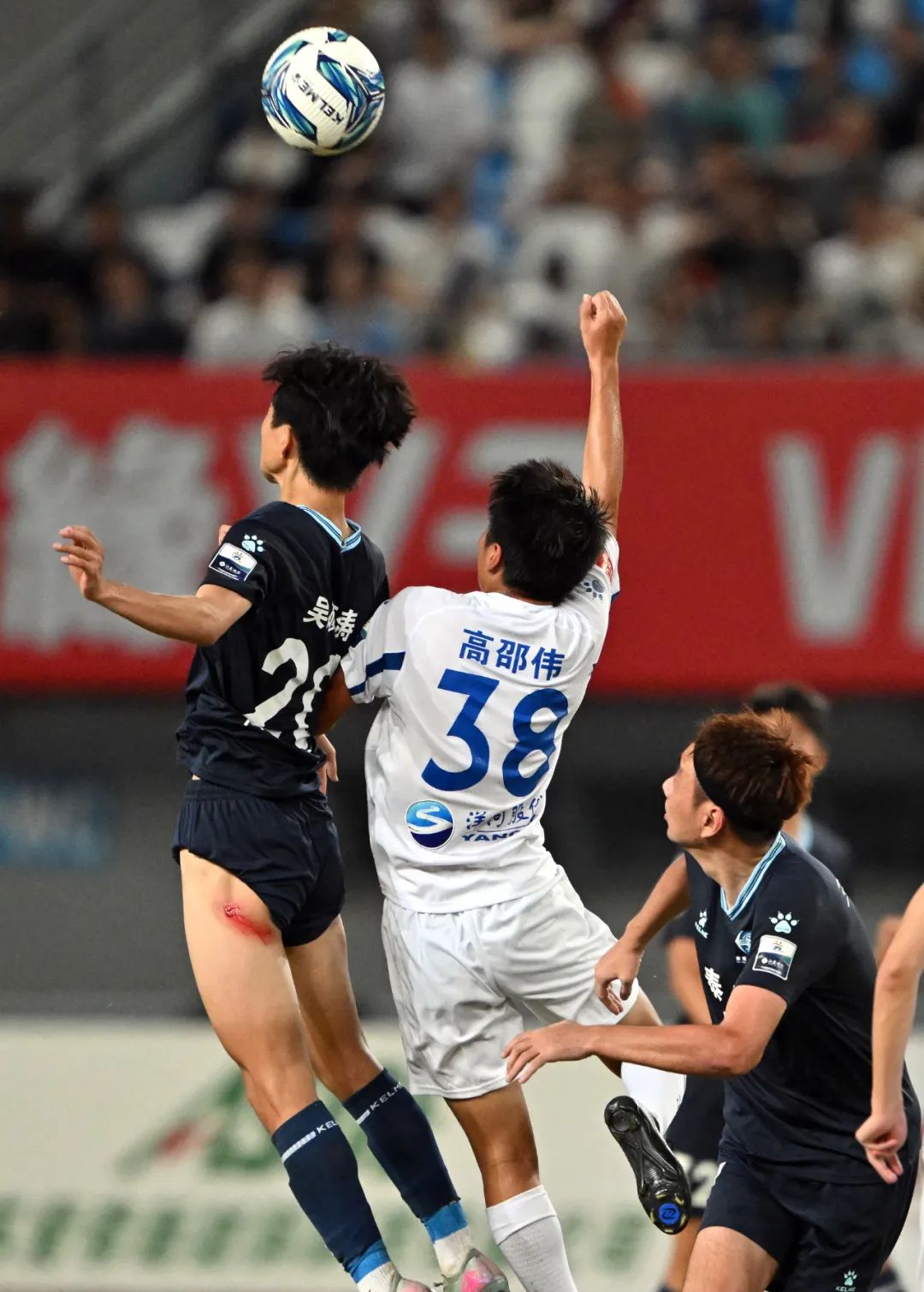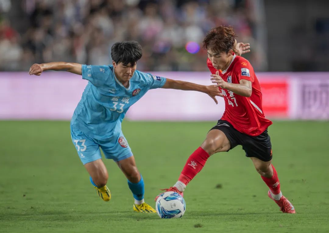 2025年7月19日晚,“苏超”比赛现场,盐城队与南通队展开激烈角逐。比赛中,盐城队(浅蓝色,20号)与南通队(红色,8号)球员跃起争顶头球,绿茵对抗一触即发 。戚晓云 摄