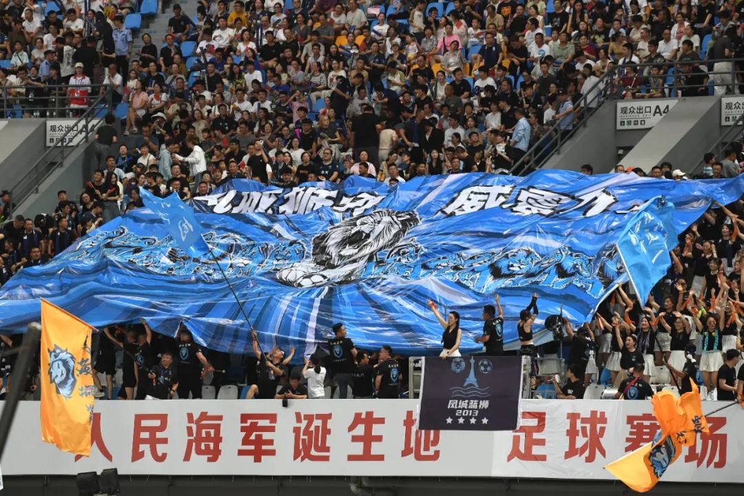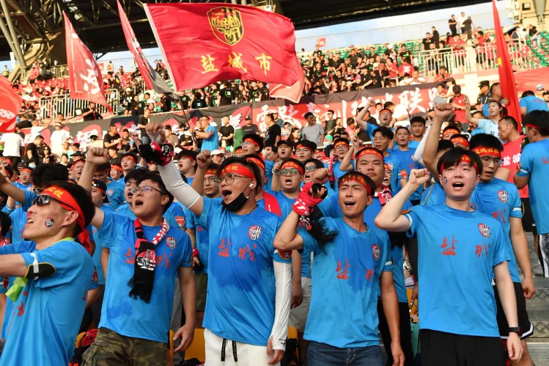南通和盐城两队球迷为场上球员加油,团结旗帜飘扬。余萍 摄