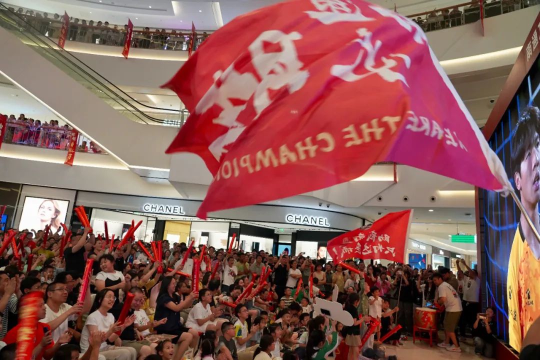 7月19日晚,“苏超”第七轮南通队对阵盐城队,南通全域主场,南通万象城里观赛的球迷为南通队欢呼。 李晓燕 摄