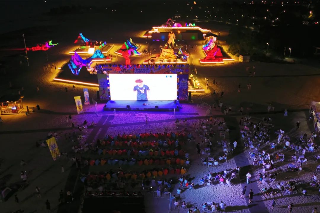 7月19日晚,盐城射阳县日月岛康养旅游度假区,市民通过大屏直播观看“苏超”第七轮南通队和盐城队的比赛。彭岭 摄