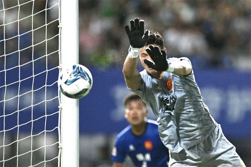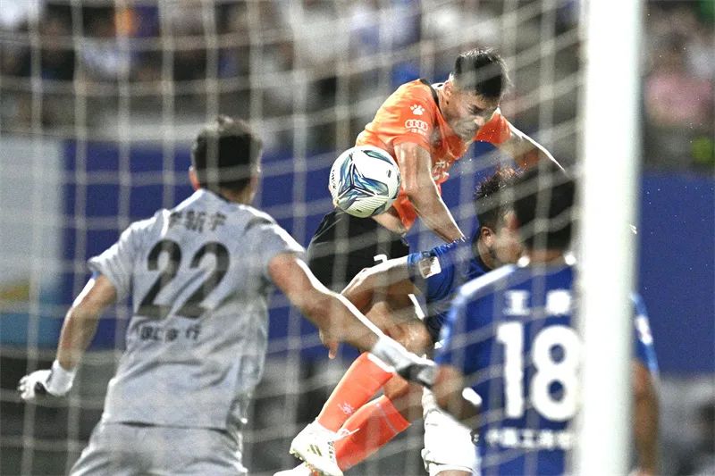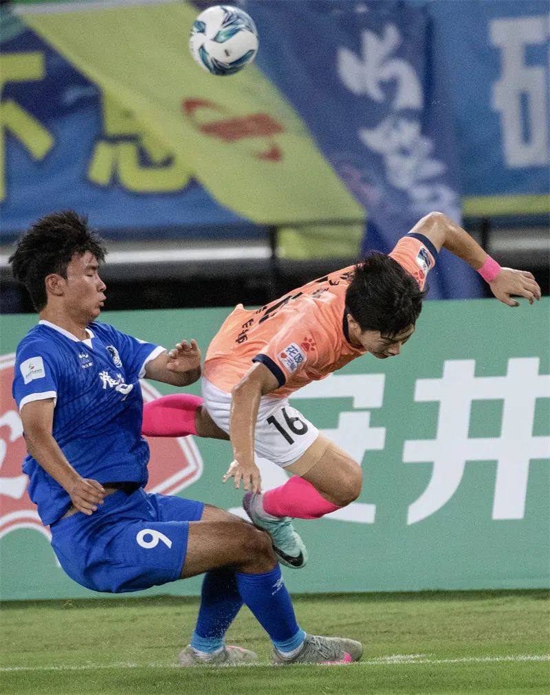 7月20日晚,“苏超”第七轮苏州队VS镇江队比赛中,苏州队球员寇程“倒挂金钩”。蒋文超 摄