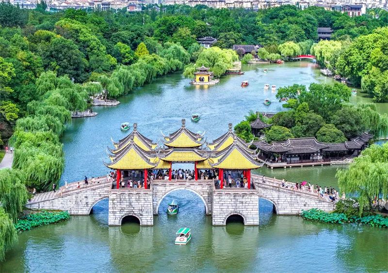 7月20日,“苏超”第七轮扬州队主场对阵南京队。扬州市面向其余十二个市市民实行全市国有收费景区日间免费入园政策,图为游客在扬州市瘦西湖风景区游览。任飞 摄