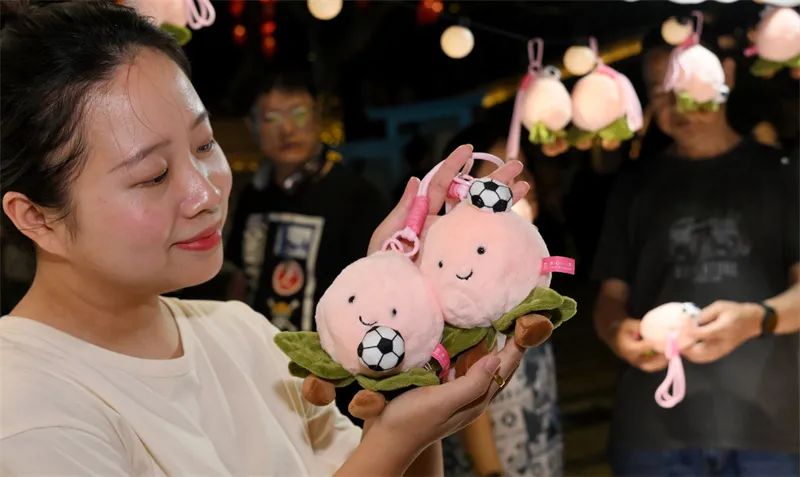 “锡厉哥”泥娃娃、缠花蜜桃发簪、磁吸足球水蜜桃挂件……多款融合“苏超”元素的文创产品亮相无锡清名桥广场,受到消费者青睐。图为具有磁吸功能的水蜜桃挂件,足球可以移动。余萍 摄