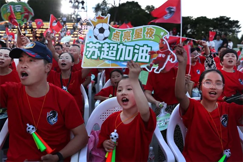 7月20日晚,盱眙县市民在第一山广场观看“苏超”比赛,为球员加油鼓劲。许昌银 摄