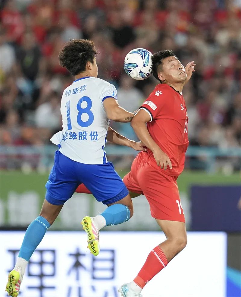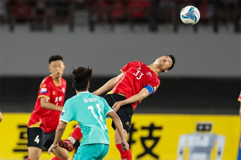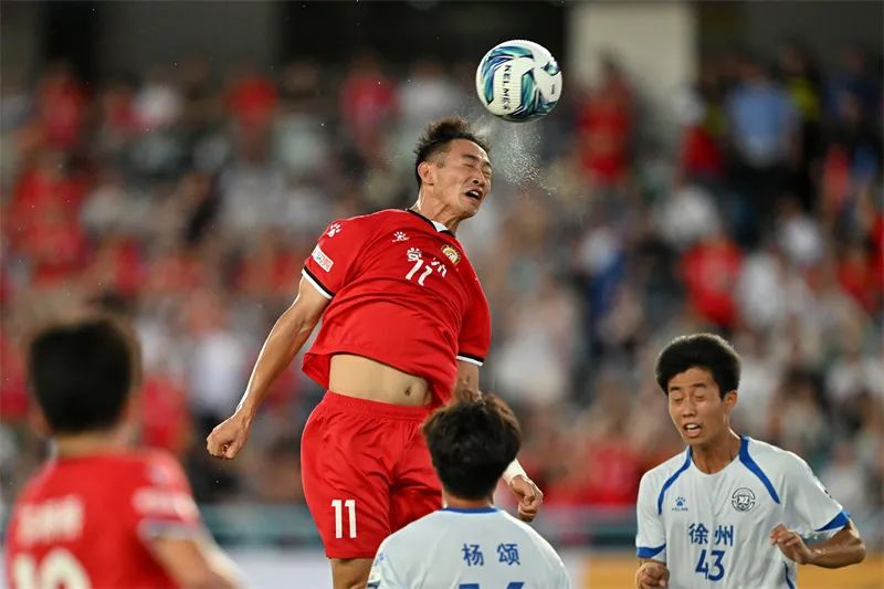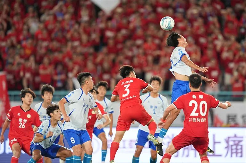 7月20日晚,“苏超”第七轮,常州队主场迎战徐州队。常州队25号球员夏宝龙奋力抢球。沈宇翔 摄