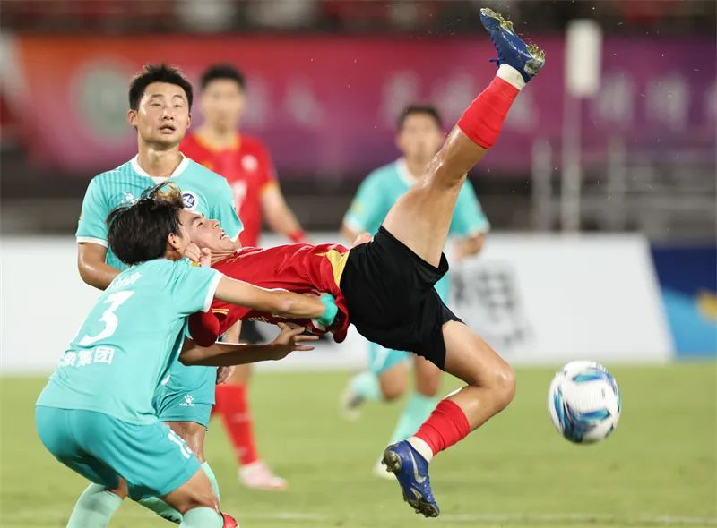 7月20日,在“苏超”赛场无锡队对阵淮安队的比赛中,双方运动员激烈拼抢。郎从柳 摄