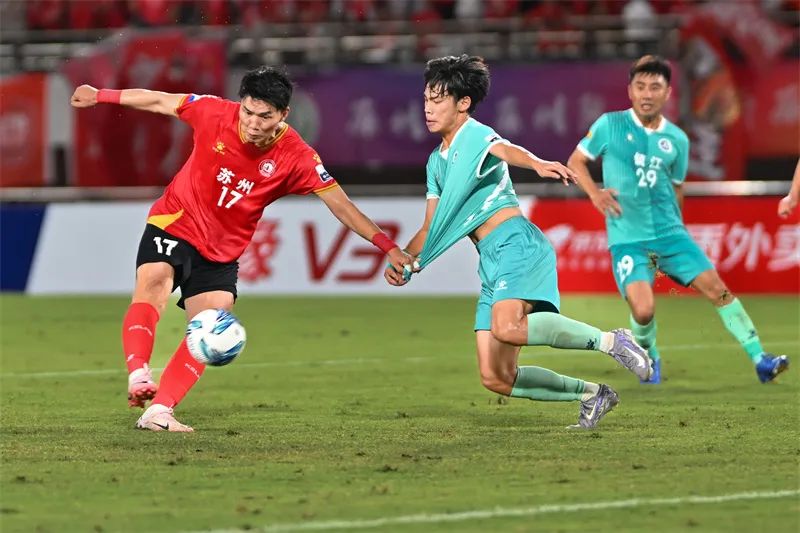7月20日,“苏超”第七轮苏州队主场4比0大胜镇江队,双方球员在激烈争夺。张从余 摄