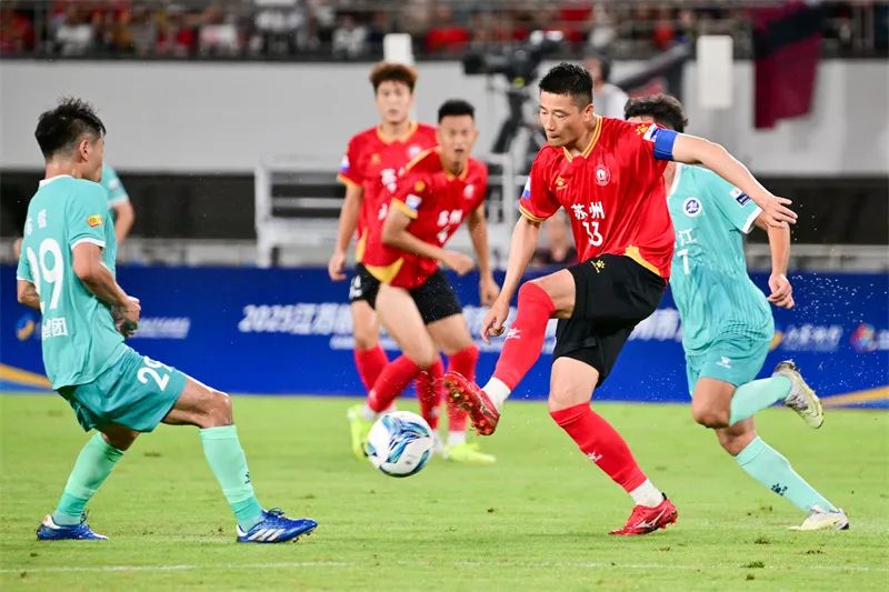 苏州队王飞(左二)取得首粒进球后和队友庆祝。蒋文超 摄