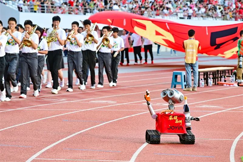 扬州赛场机器人踢足球助威。吴俊 摄