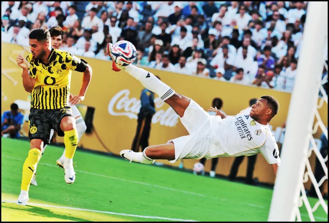2025年7月5日,在美国新泽西大都会人寿体育场举行的2025世俱杯的比赛中,皇家马德里队球员姆巴佩倒钩射门得分,帮助球队3比2战胜多特蒙德,挺进四强。刘占崑 摄