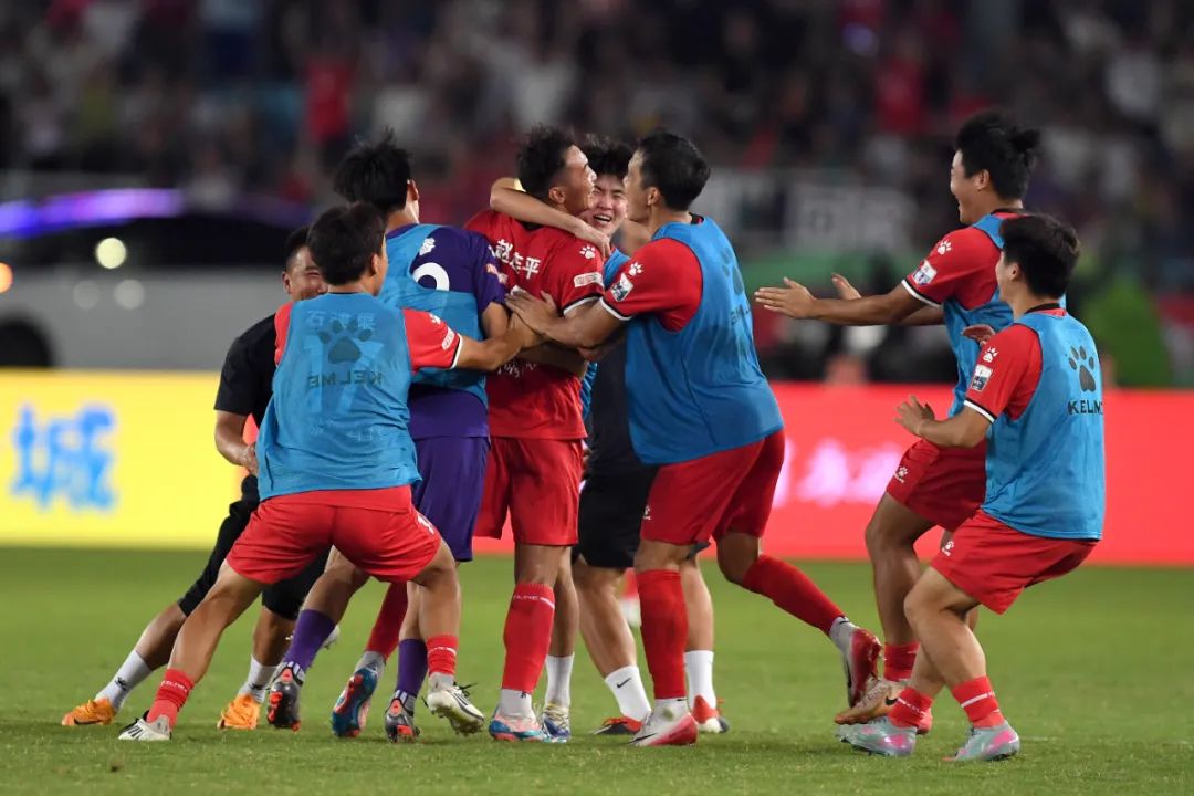 2025年8月16日,“苏超”第九轮常州队主场迎战镇江队,经过激烈比拼,常州队以1:0战胜镇江队,实现“苏超”比赛进球零的突破。 肖勇 摄