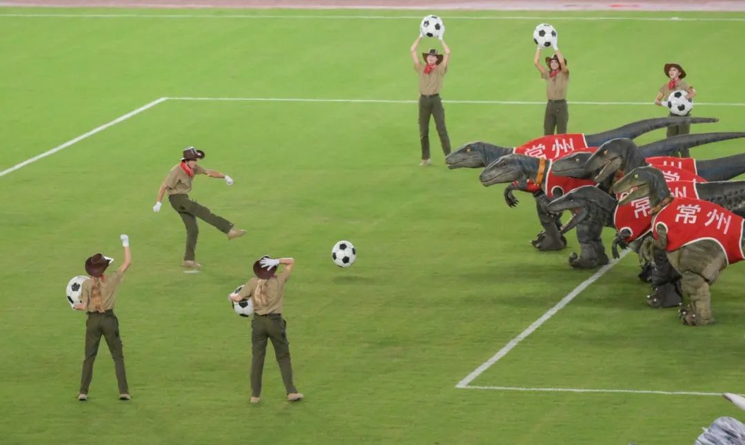 常州队VS镇江队比赛现场热情的球迷和恐龙表演。王锐 摄