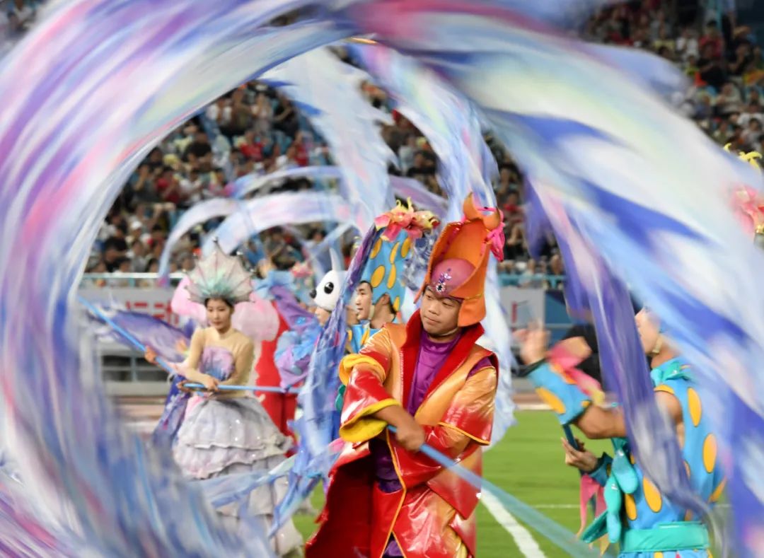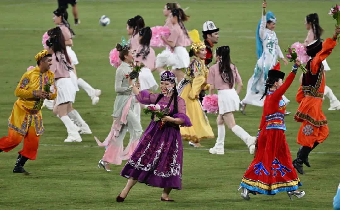 苏州队VS泰州队比赛中场休息环节,新疆克孜勒苏柯尔克孜自治州歌舞团献演民族歌舞《克孜勒苏欢迎您》,助威“苏超”。 管钰楠 摄
