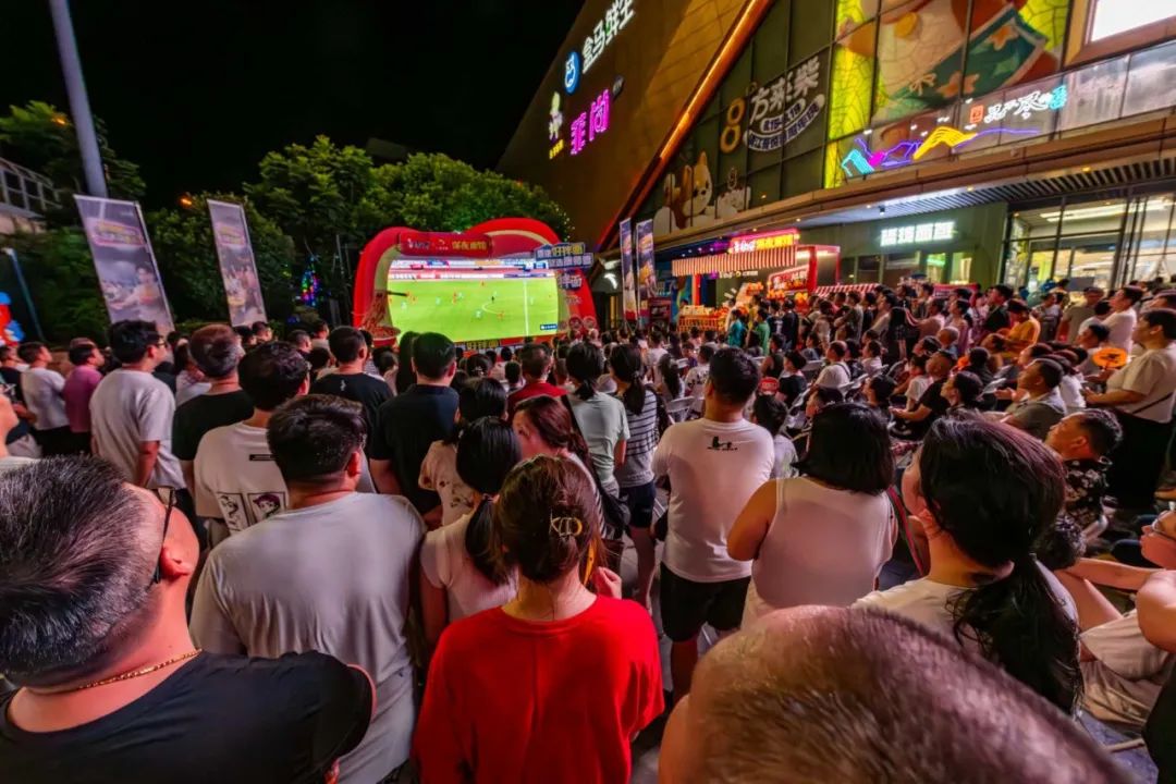 “苏超”常州队VS镇江队比赛,镇江市吾悦广场大屏前,观众现场观看球赛。唐善宝 摄