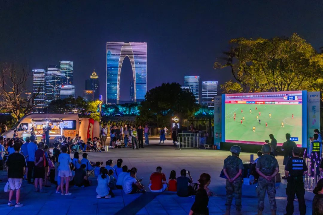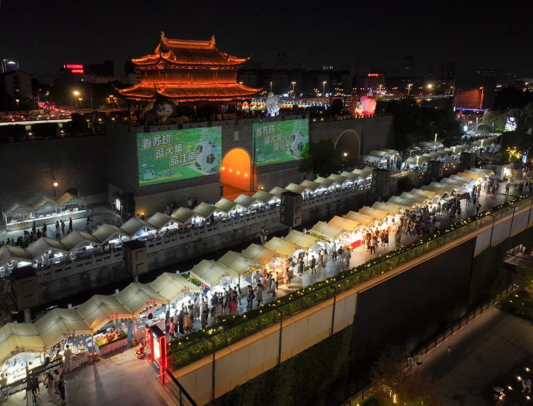 8月16日晚,苏州借赛事东风在相门城墙广场举办“苏州超级夜”主题市集,构建“足球+文旅”消费新场景,设置36个摊位推出各类文创产品和传统美食等,市民游客聚集在大屏幕前看“苏超”、逛夜市、 品江南,开启一场足球狂欢之夜,带动城市夜经济消费热。阙明芬摄