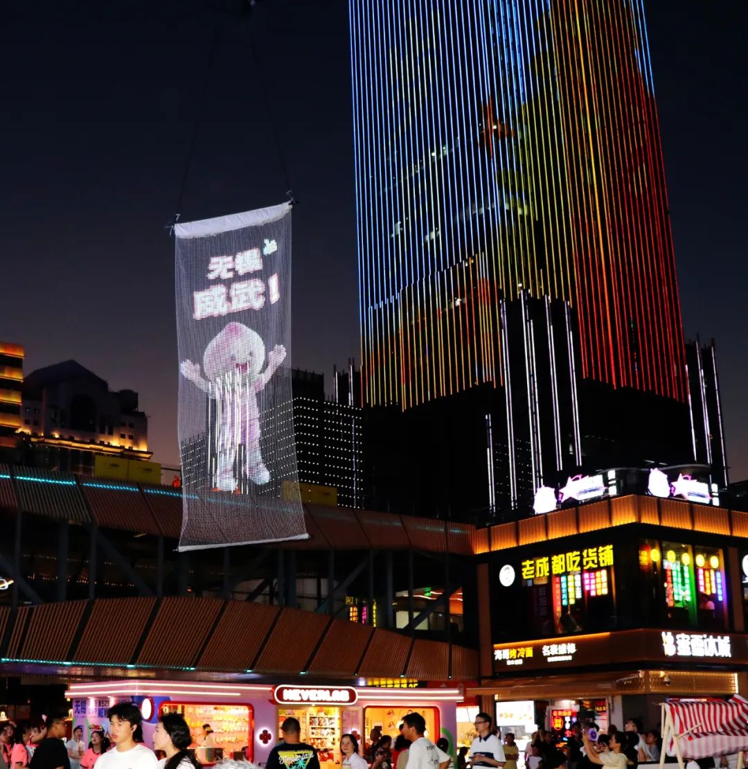 8月16日,“苏超”第九轮无锡队VS徐州队,在无锡二泉广场直播现场一块“飞天屏”在夜空中亮相,呈现出多个“苏超”经典场景,无锡梁溪文旅用无人机飞天柔性屏低空立体助威“苏超”。毛伟骏 摄