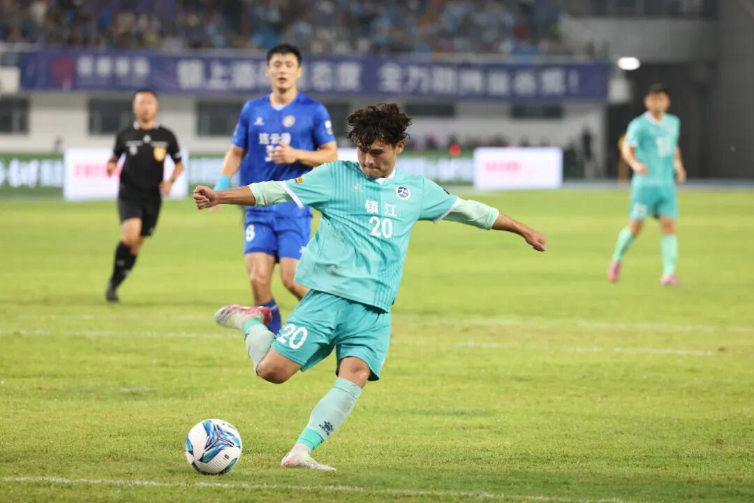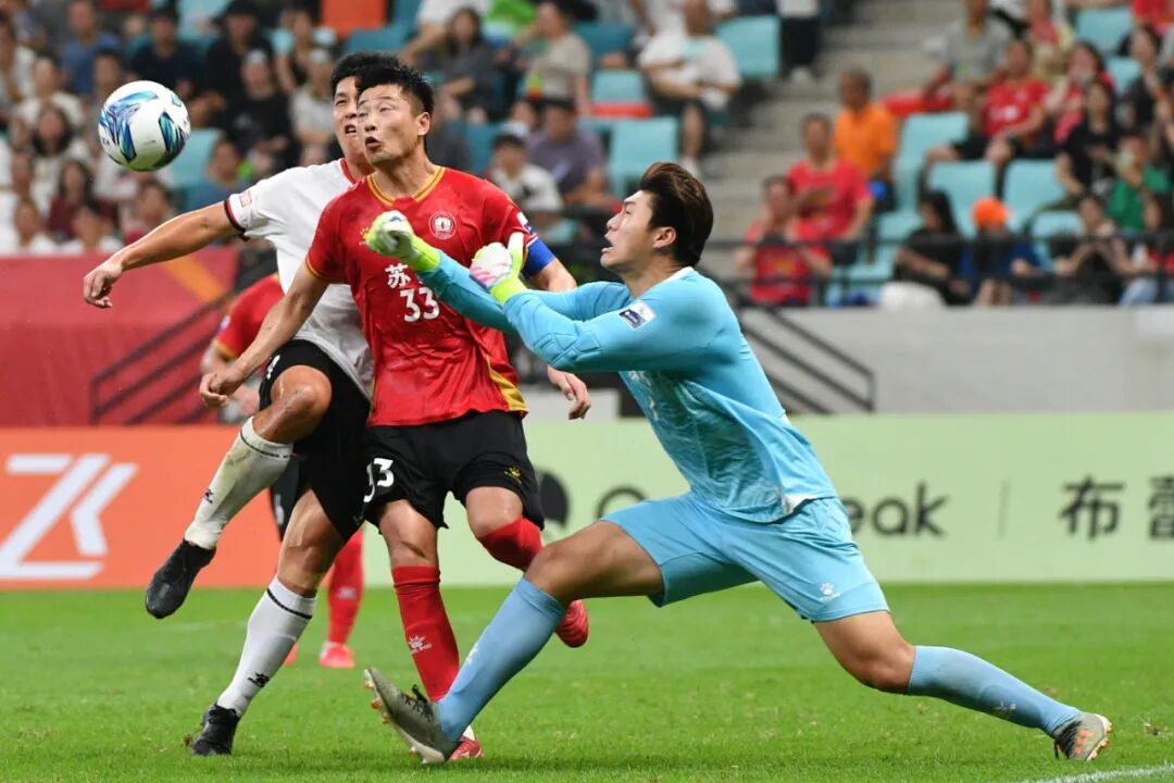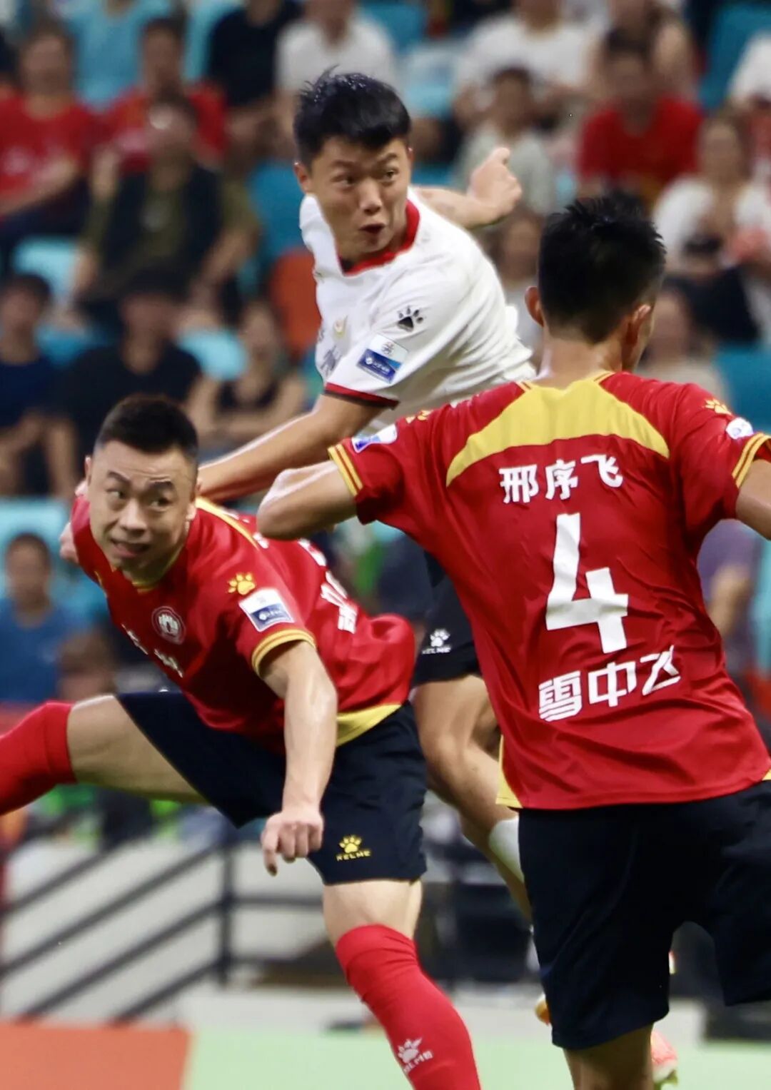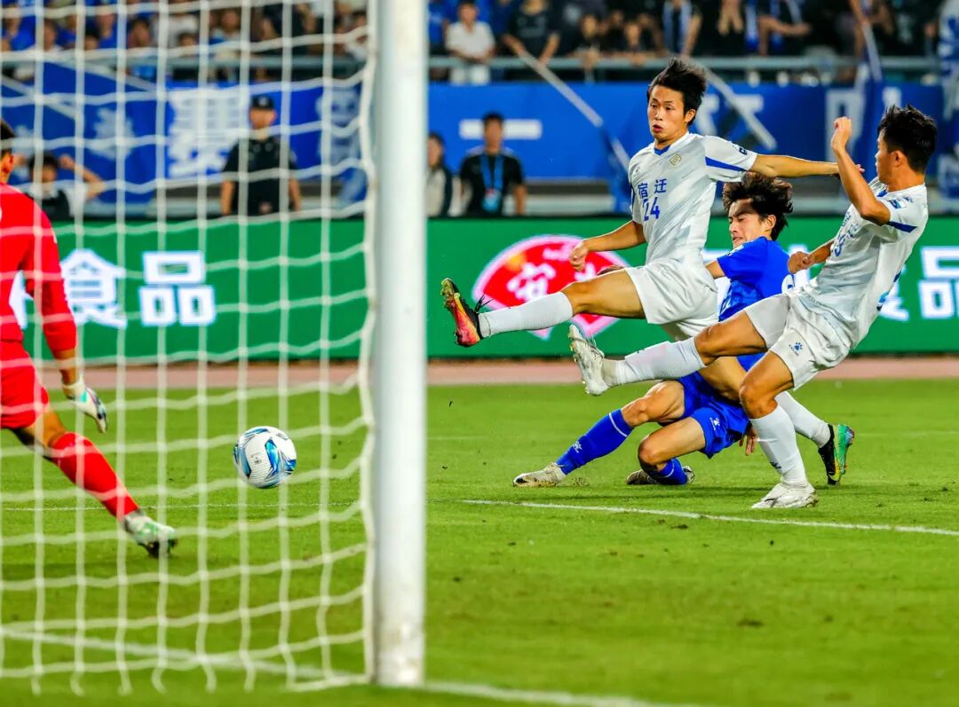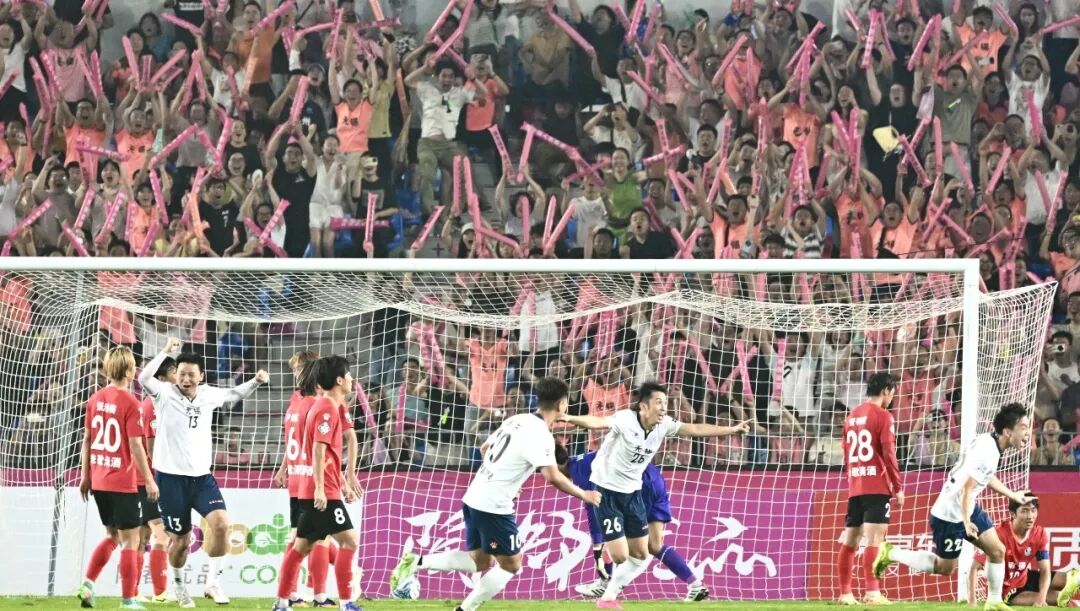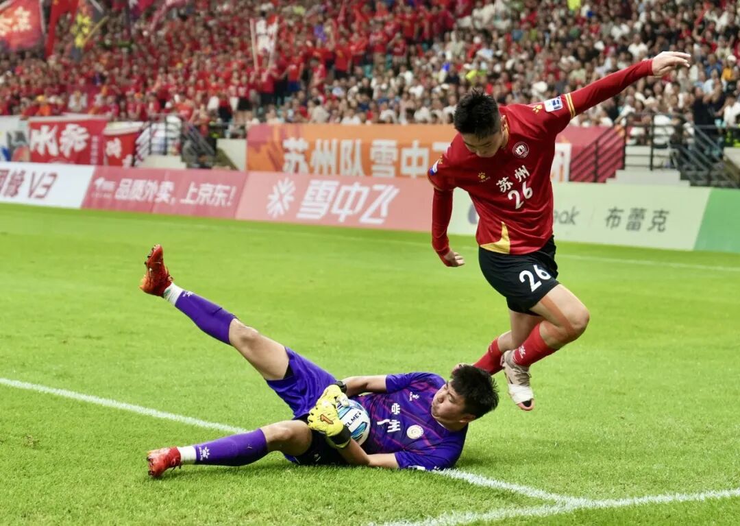 伤停补时阶段,苏州队26号球员边禹豪攻入一球,绝杀对手,最终苏州队3:2胜常州队。袁新宇 摄