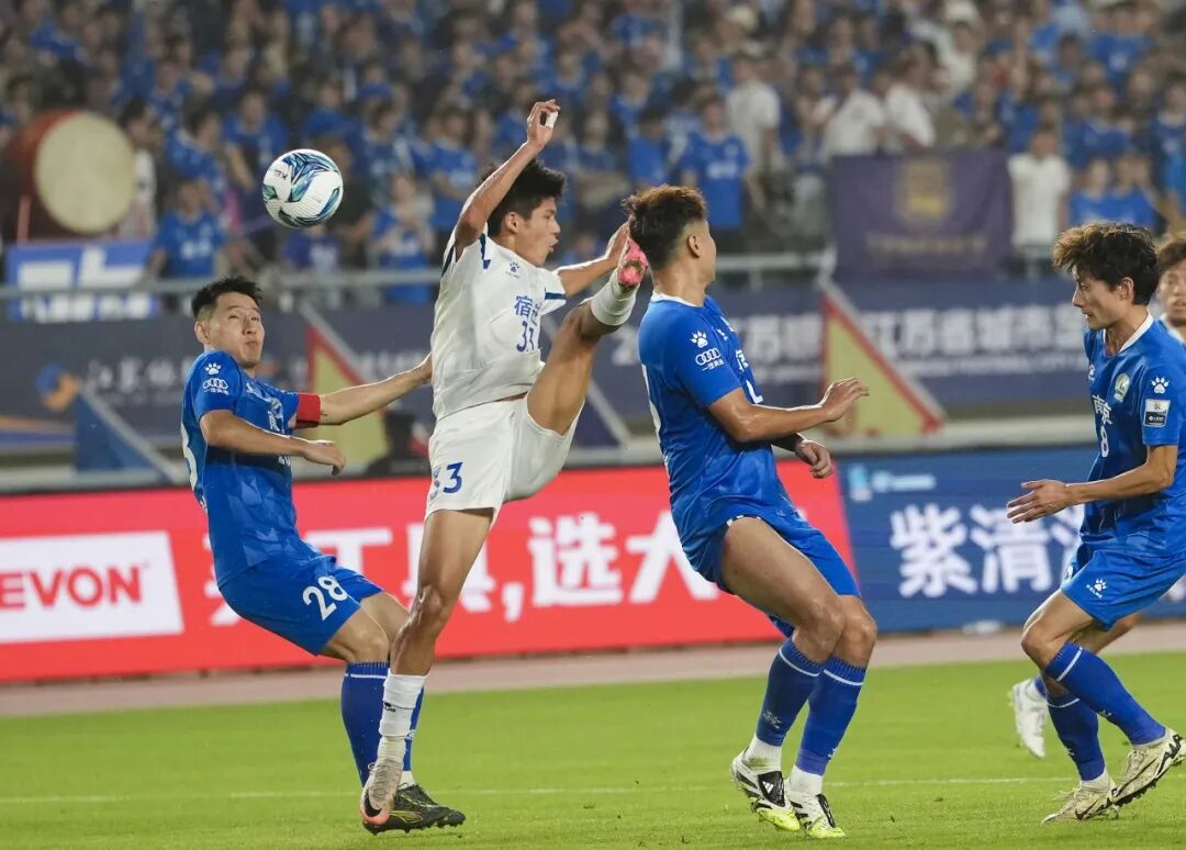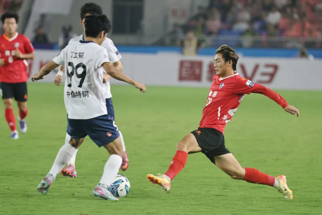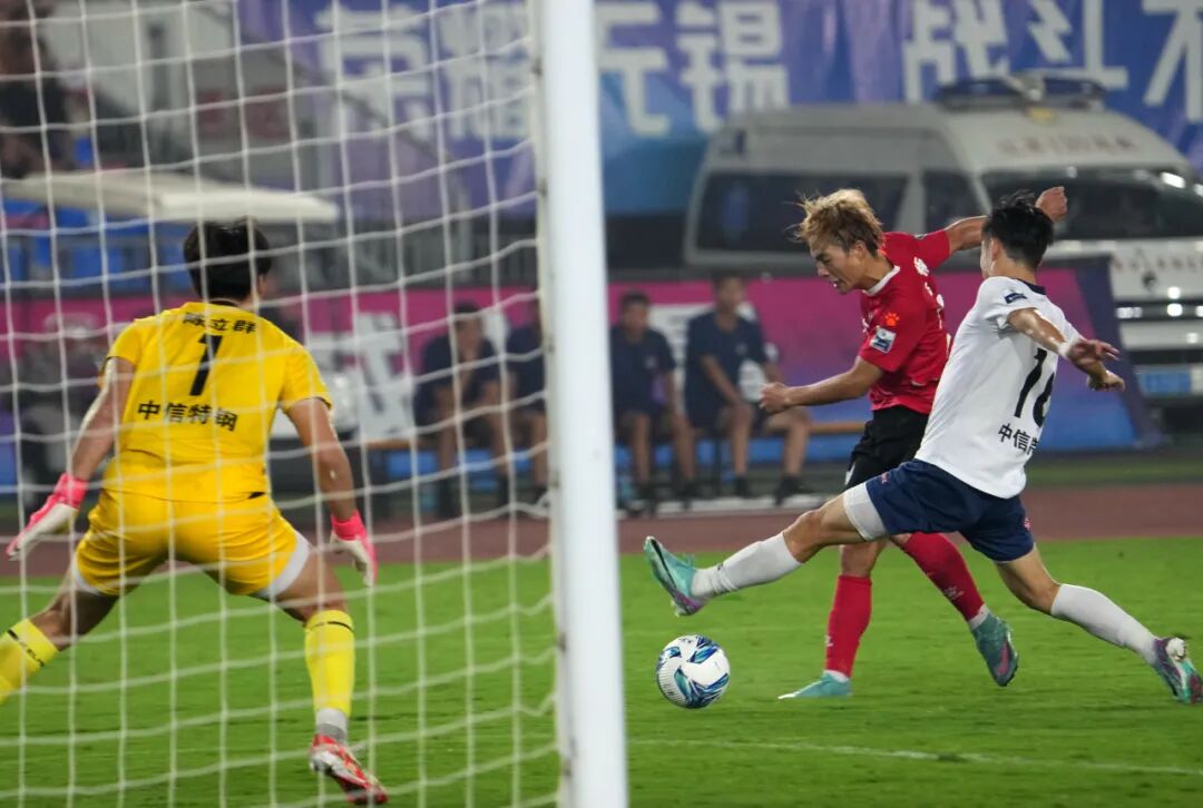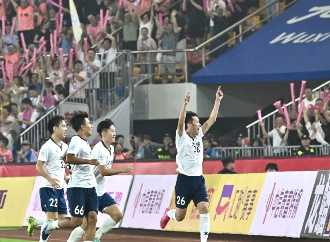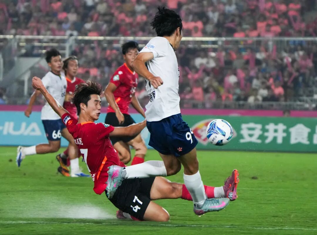 伤停补时阶段,苏州队26号球员边禹豪攻入一球,绝杀对手,最终苏州队3:2胜常州队。袁新宇 摄
