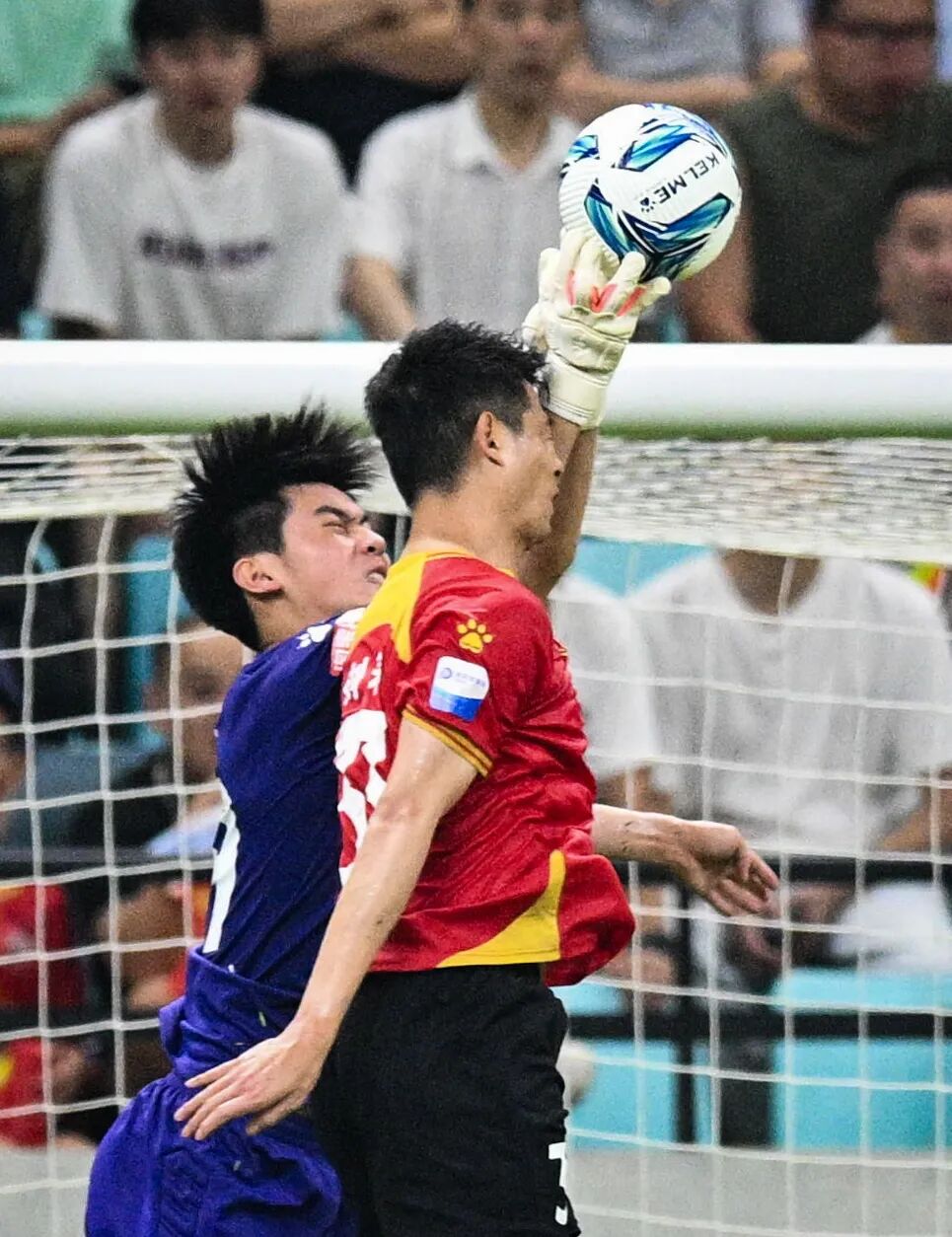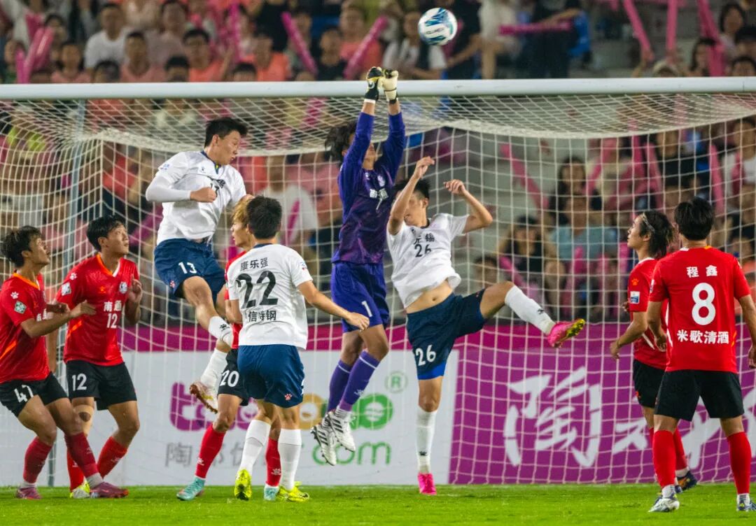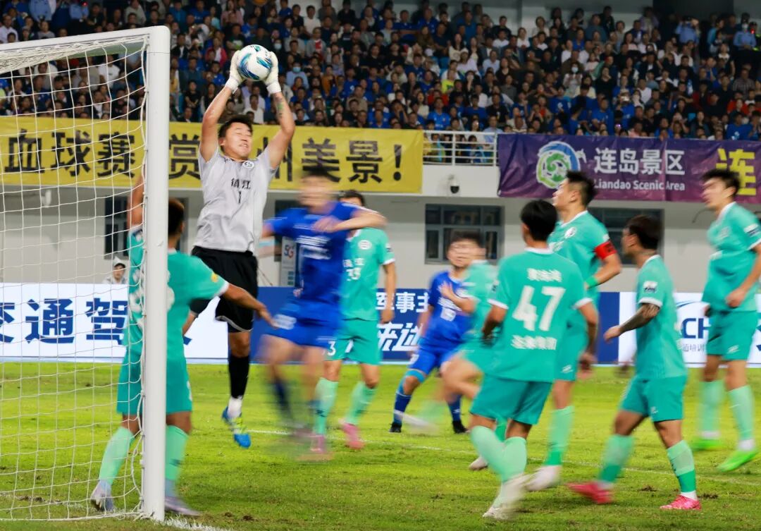 南通队守门员奋力扑救,成功化解危机。曹俊 摄