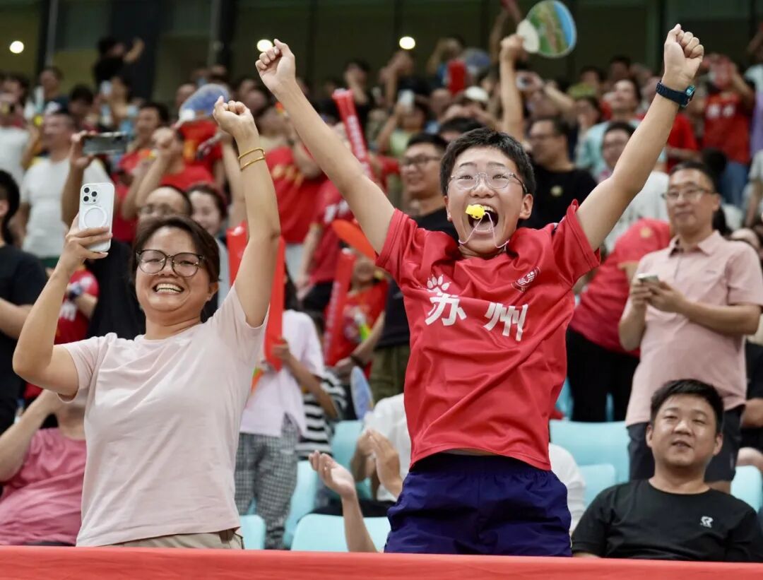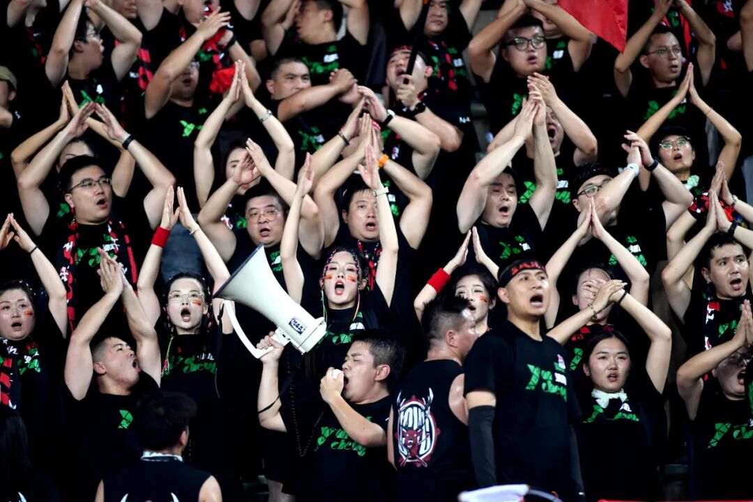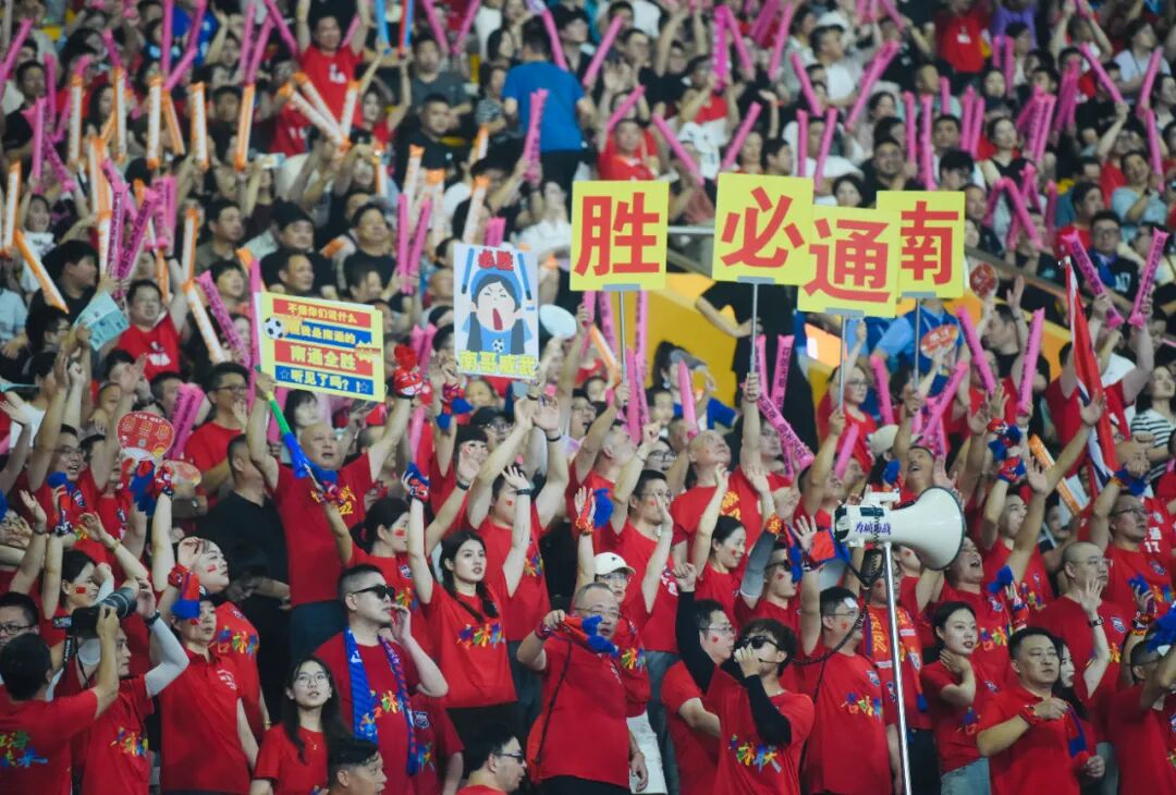 球迷振臂欢呼为球队加油。郎从柳 摄