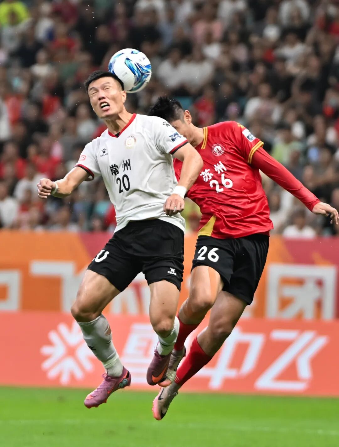 无锡队球员与南通队球员争顶头球。曹俊 摄