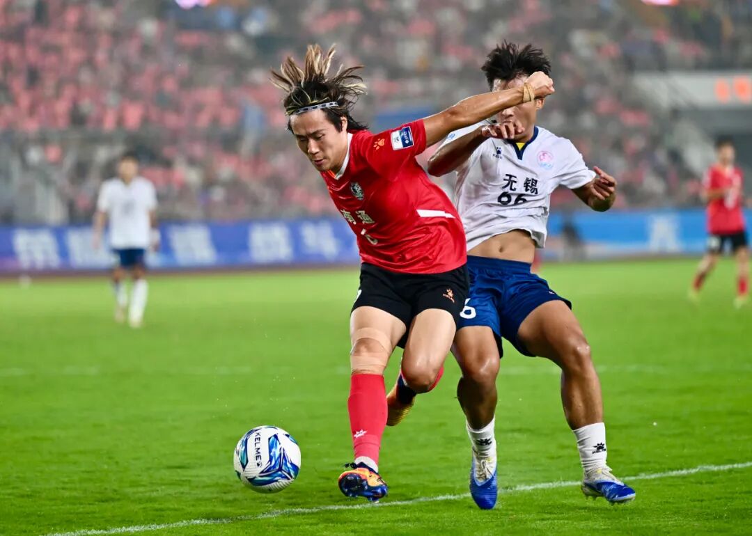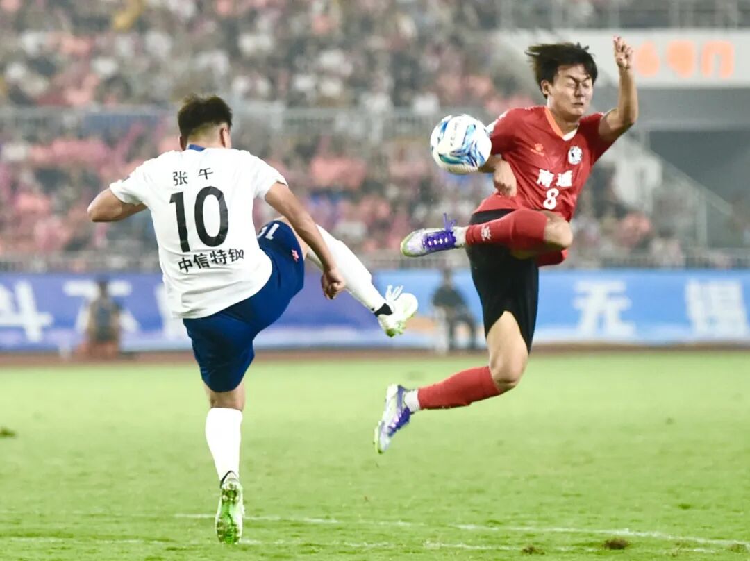 9月27日晚,“苏超”第13轮无锡队VS南通队在宜兴市体育中心举行,最终双方1:1踢平。宗晓东 摄