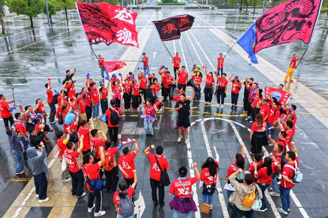 9月27日,盐城东台女球迷聚集德润广场,为盐城队加油呐喊!梅国强 摄
