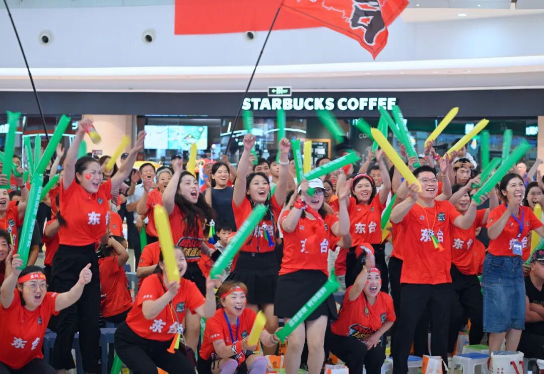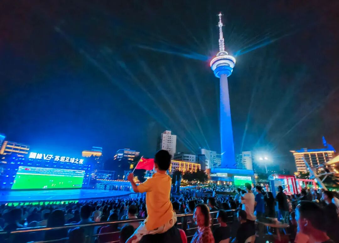 9月27日晚,“苏超”常规赛最后一轮,南通队客场挑战无锡队的比赛在宜兴市体育中心体育场开赛。南通市民、球迷在南通环西文化广场观看比赛直播,为球队加油。许丛军 摄